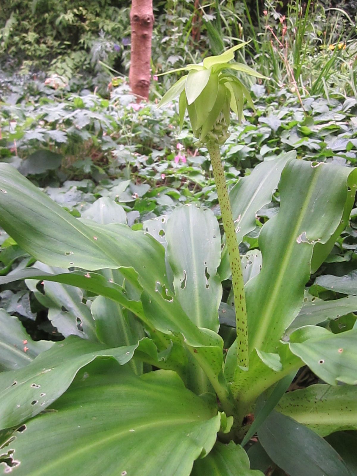 Al jaren komt er een plant op in de tuin waar ik eigenlijk weinig aandacht aan schonk. Ik dacht aan een soort nestvaren. Maar nu komt er opeens een bloemstengel uit. Geen idee in welke richting ik moet zoeken