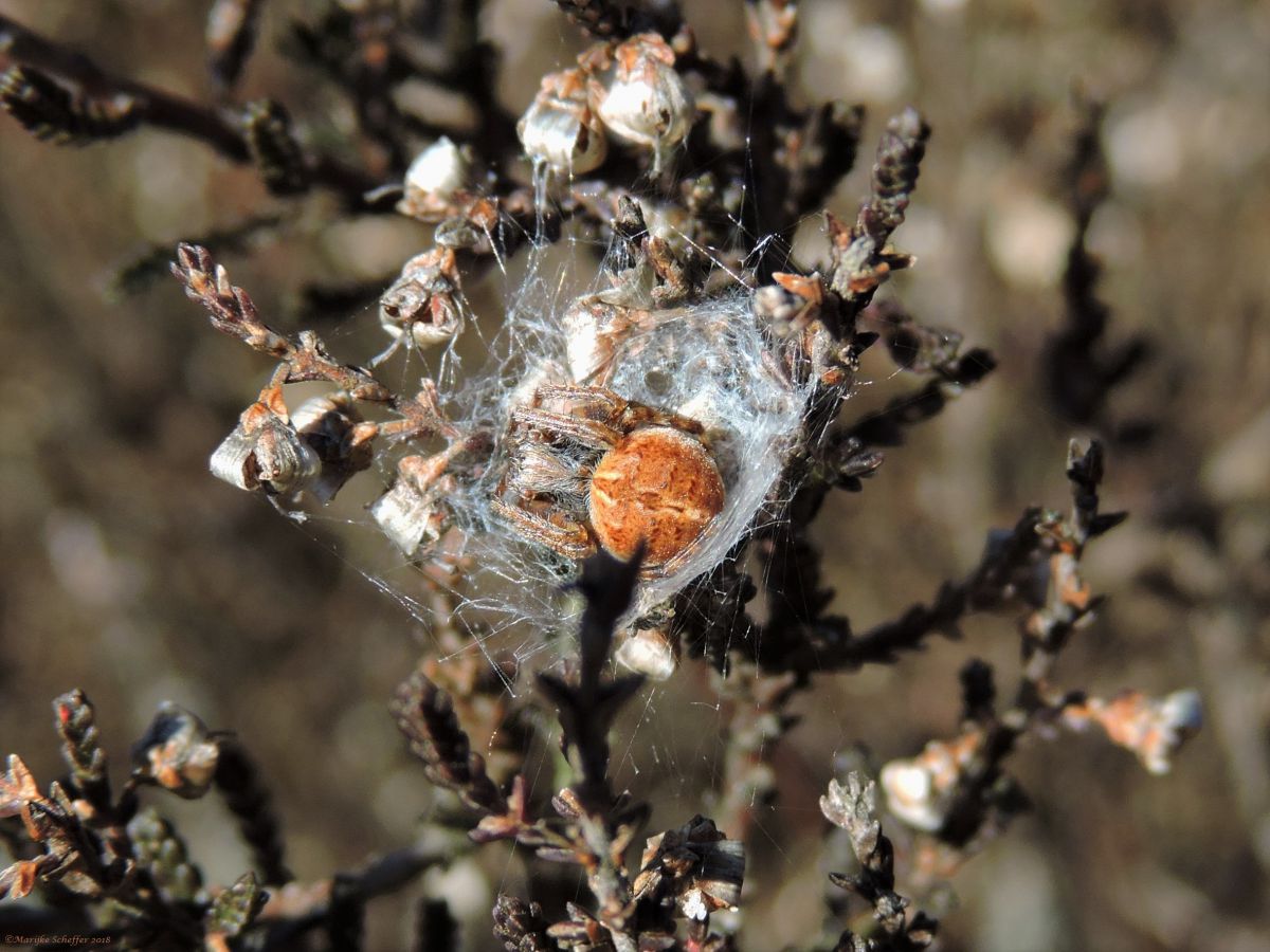 Rond het middaguur tijdens wandeling "op" de heide gezien dit spinnetje wat is zijn/haar naam? Zie hem wel vaker het hele jaar door op verschillende plekken maar nog niet eerder zo in zijn/haar "nestje"