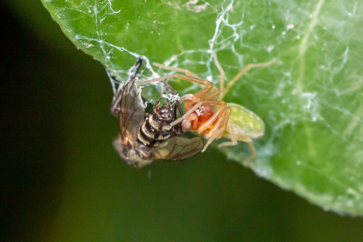 Op een blad van de klimop zag ik een spin die een vlieg in zijn web had. Even later kwam er een andere spin. Na de begroeting ging de andere spin verder aan de vlieg. Welke spin is dit en is dit normaal gedrag?