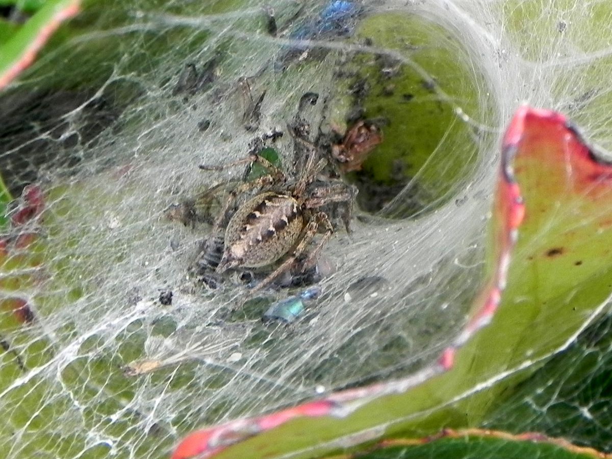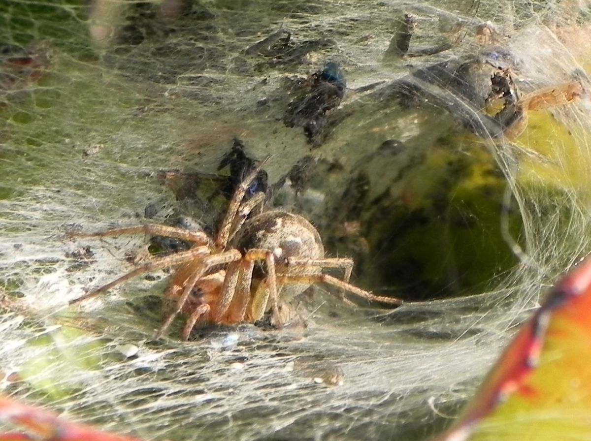 Helaas heb ik geen hele foto van de spin. Ze zijn nogal schuw en duiken snel de trechter in.