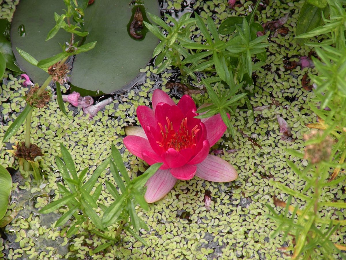 Ook daar drijven een aantal bloeiende waterlelies in.