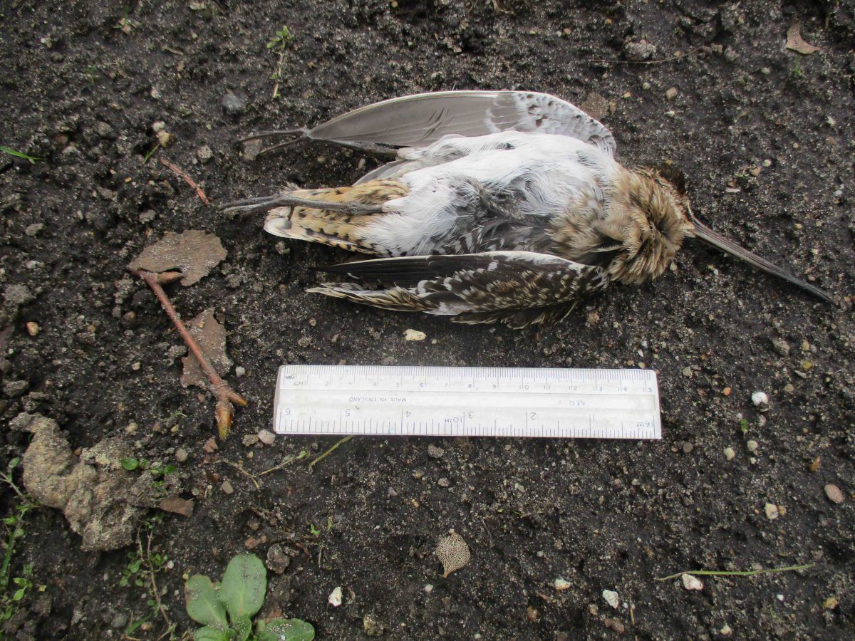 Beste allen, dank voor alle reacties. Ik ga er morgen weer langs om het lijkje op te meten, als het er nog ligt, en zal het fotograferen met een meetlat ernaast. Door jullie ben ik op het spoor snip gezet (dacht ik niet meteen aan omdat ik daarbij aan een watervogel dacht). Kijkend nu op de juiste pagina's in Thieme, denk ik dat het een bokje was. En nu begrip ik hoe het daar is komen te liggen - aanvlieging met raam - en ook dat merkwaardige makke duizelige watersnip bij ons in de straat enkele jaren geleden. Die was beduidend groter - twee handen vol. Ik had vanuit mijn raam een paar achter in de binnentuin een aantal keren waargenomen.