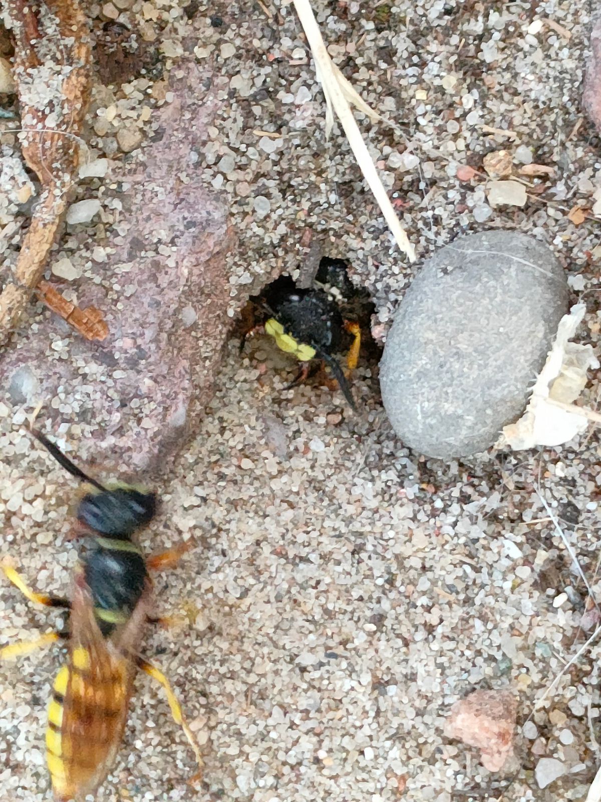 Dit insect is een holletje aan het graven tussen mijn stoeptegels. Hij graaft als een hondje (met de voorpoten het zand naar achteren). Ik vind hem zelf het meeste op een blokhoofdwesp lijken, maar het achterlijf lijkt geler dan de foto's die ik van deze wesp zie op internet. Ben benieuwd.