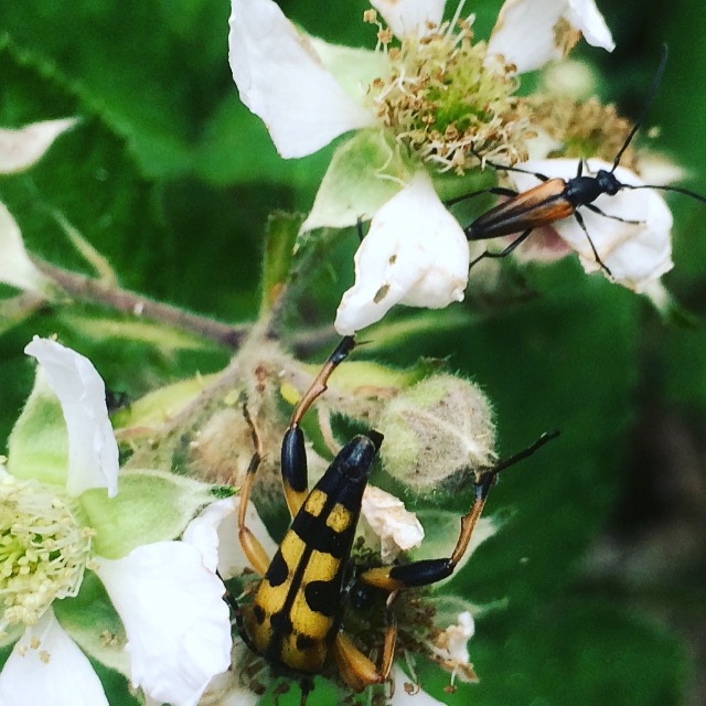 jeanette Geplaatst op 30-06-2017 om 22:11 Jammer dat de boktorren niet scherp en volledig op de foto staan.Vermoedelijk Tweekleurige smalboktor Stenurella melanura.Niet zeker dus.