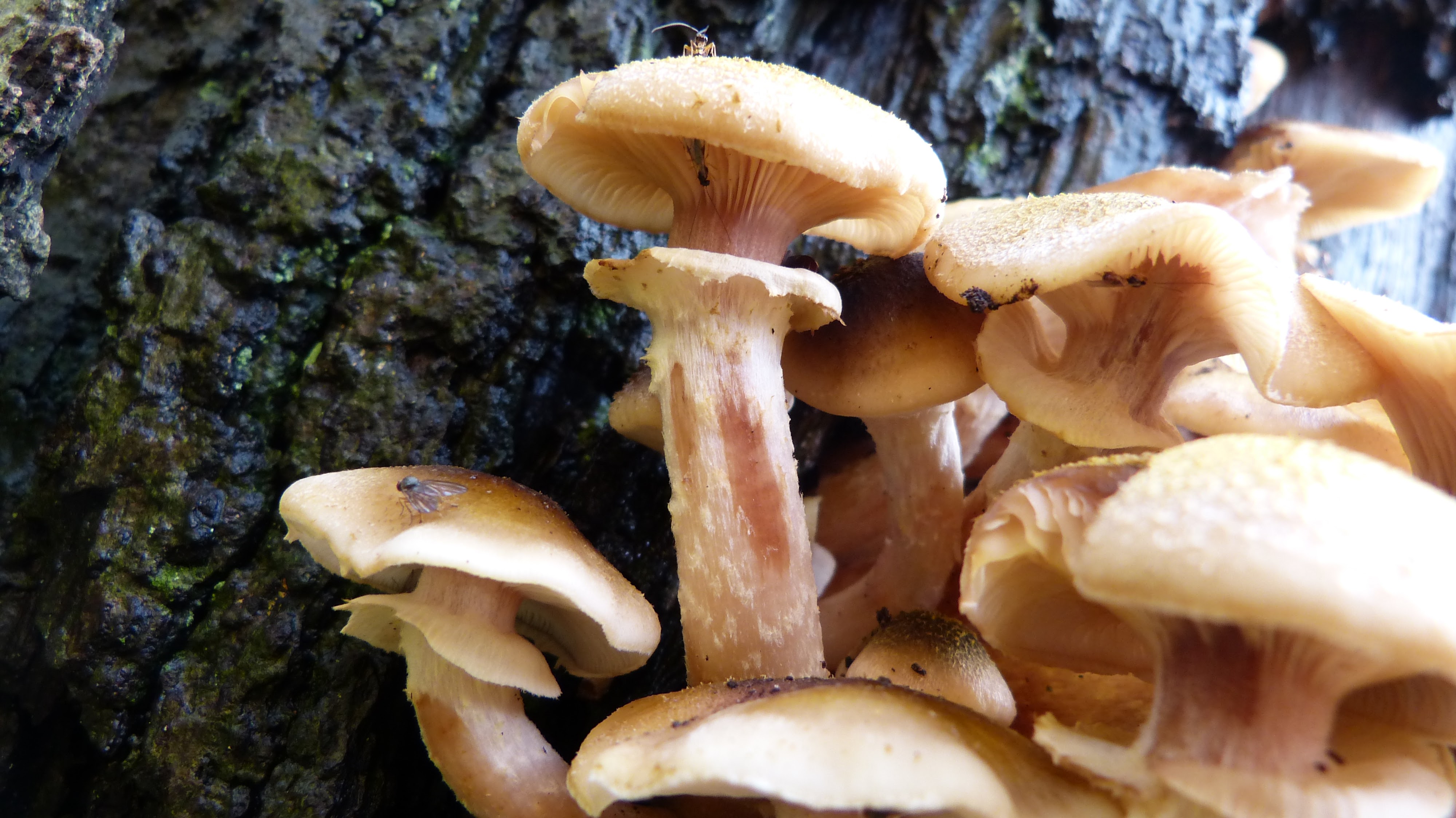 Typisch een paddenstoel die je laat in het najaar kunt vinden. Het is een van de honingzwammen. Ze zijn al op leeftijd, maar ik denk dat het de sombere honingzwam is.