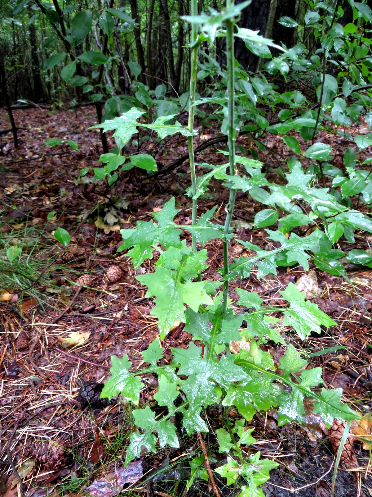 vandaag in tamelijk dicht loofbos met veel amerikaanse eiken langs bospad op zandgrond vond ik een 10 tal van deze planten met helaas nog maar enkele gele bloemetjes, kruisbloemige met 4 blaadjes. De rest was al uitgebloeid. De bladeren zijn zeer apart en ver ingesneden en lijken naar mijn beleving een beetje op het blad van de moeraseik.