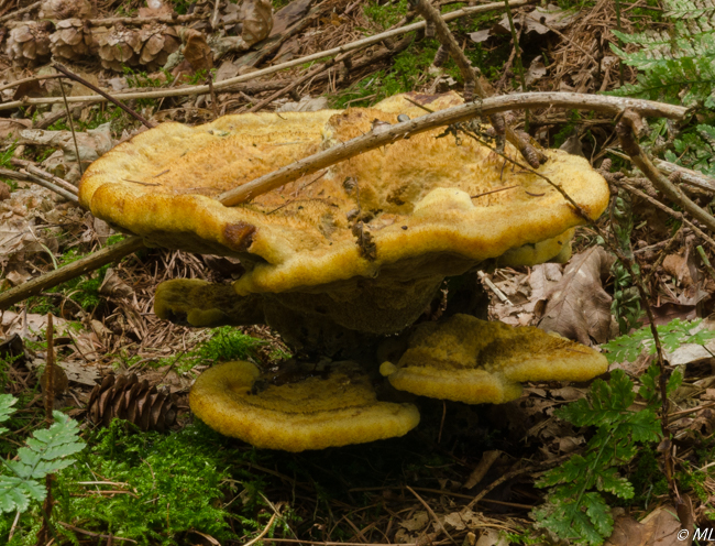 Altijd graag de onderkant beschrijven svp. Aan de kleur en de groeiwijze (hoewel vaak geheel rond) te zien is dit een dennenvoetzwam. Groeit op wortels of staat aan de voet van een naaldboom (-stronk)