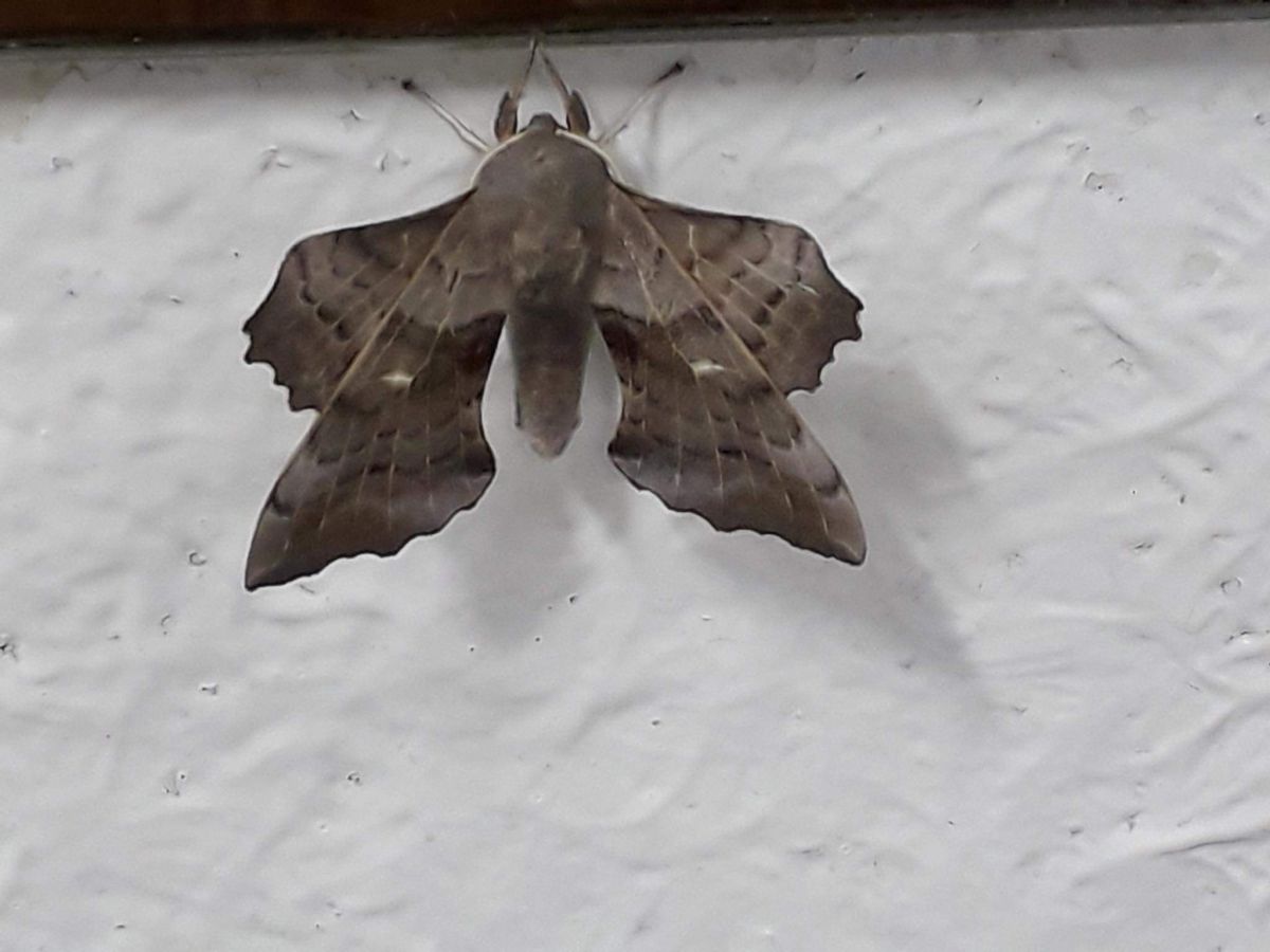 In het toiletgebouw op onze camping in België zat deze "nachtvlinder".Een groot exemplaar van wel 6 cm.Ik heb niet kunnen achterhalen wat de soort is.Wie weet het?