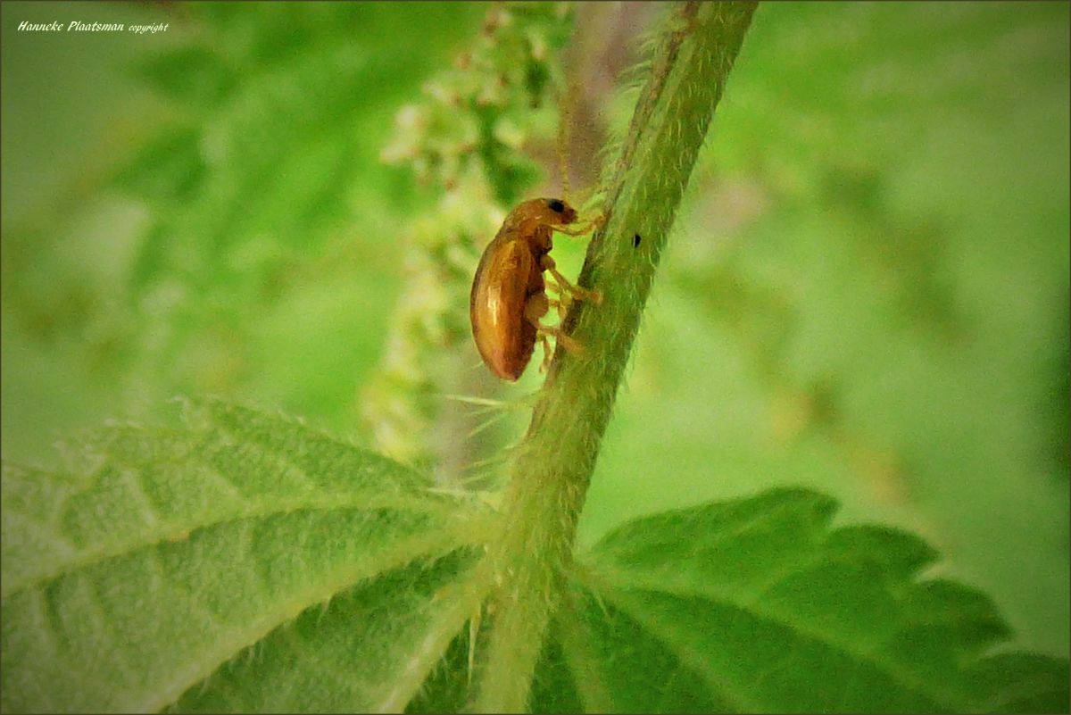 Hoe heet deze? Een paar mm. groot bruin kevertje in de brandnetels.