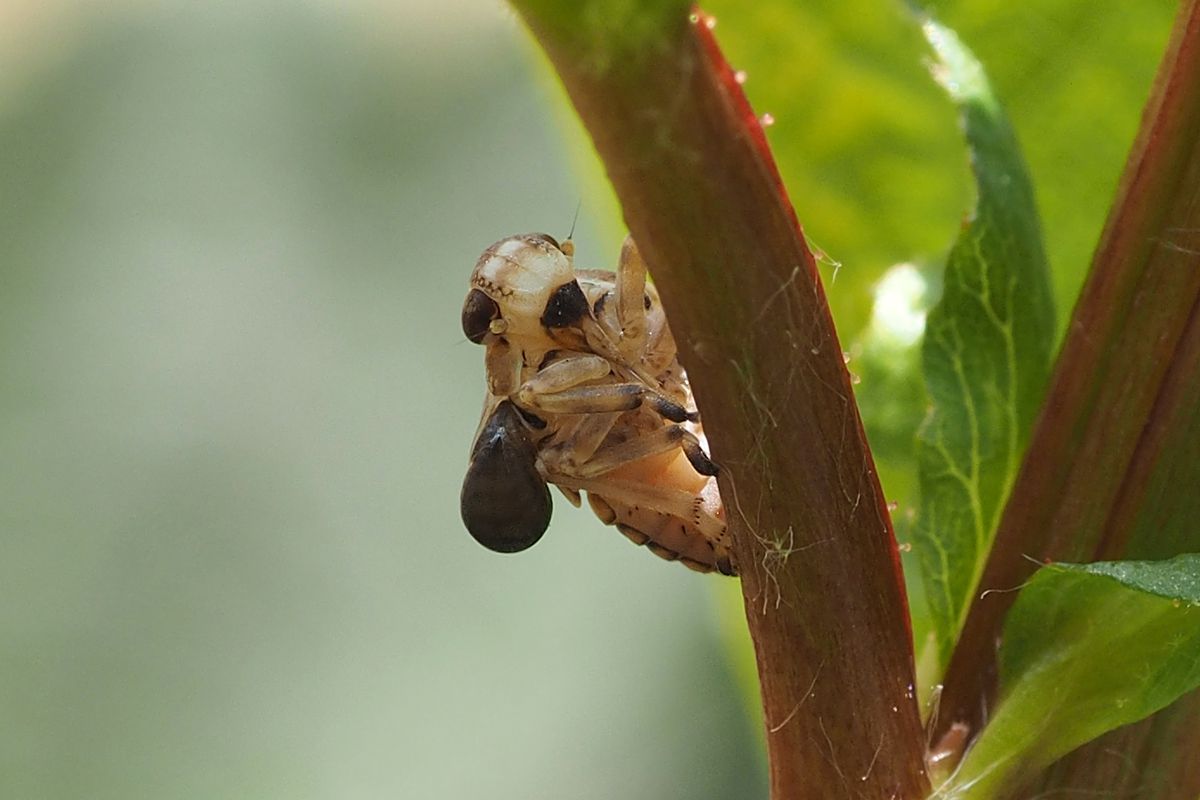 Gisteren waargenomen in de tuin in Dordrecht. Een nimf cicade ( Cicade Issus coleoptratus ) met een vreemd aanhangsel. Wat zou dan kunnen zijn?