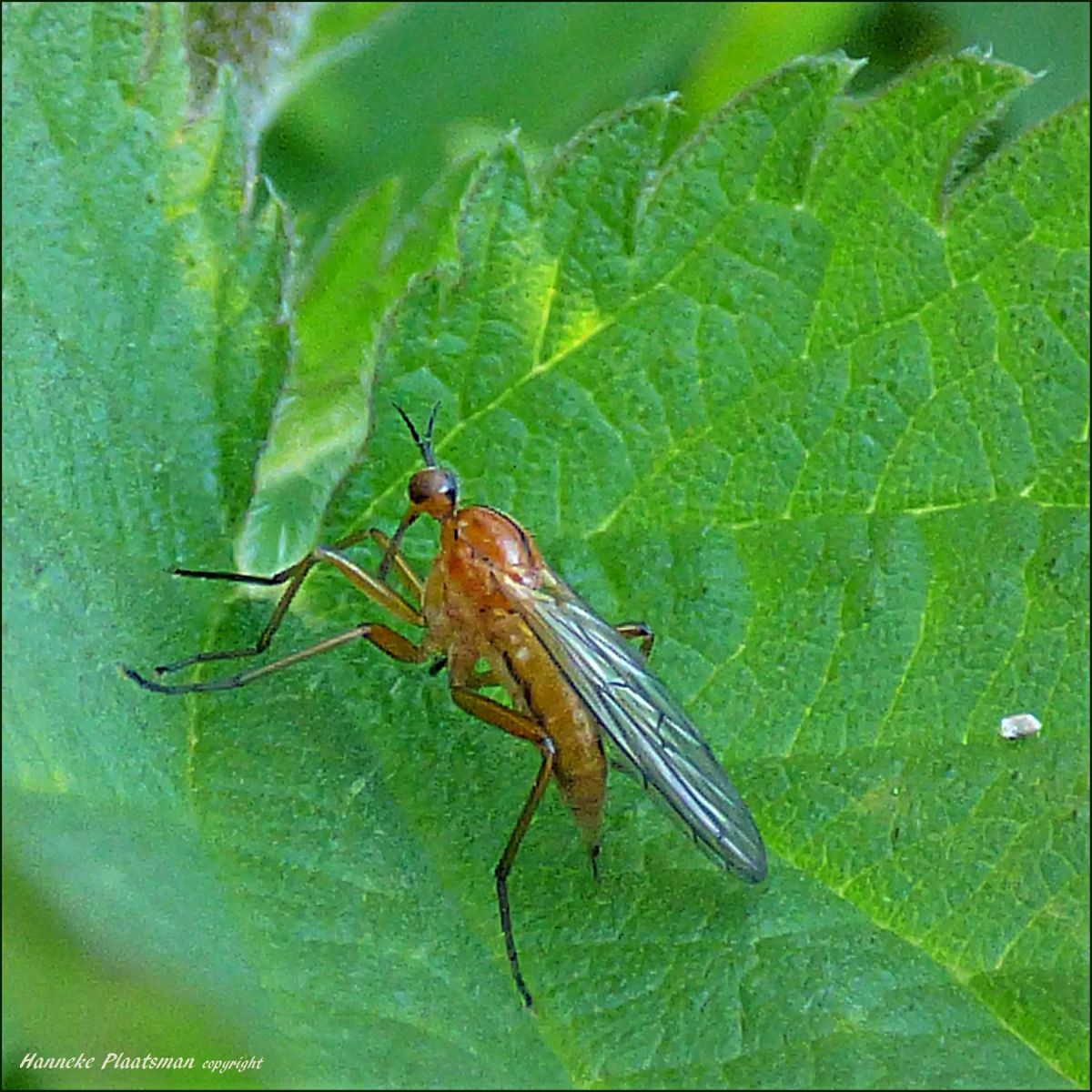 Ik dacht eerst een dansvlieg, van wege dat streepje op zijn rug, maar het kan ook wel een mug zijn, ik kan hem bij allebei niet vinden.