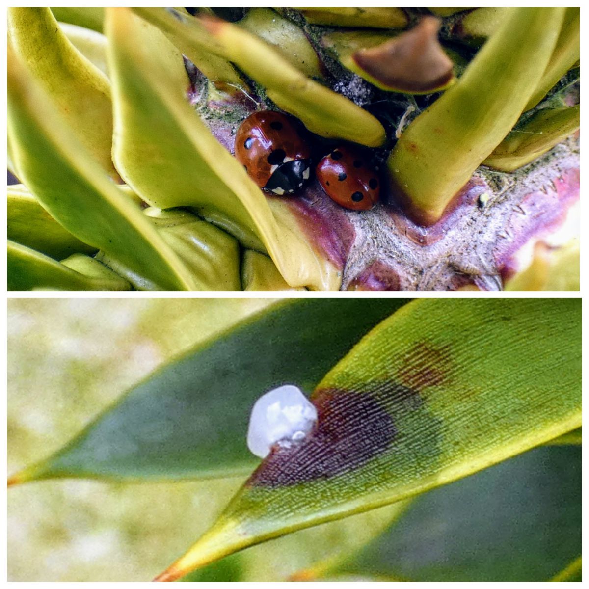 In deze boom zitten veel lieve heersbeestjes en ik zag er vlakbij dit kleine witte bolletje. Is dat een eitje van het lieve heersbeestje?