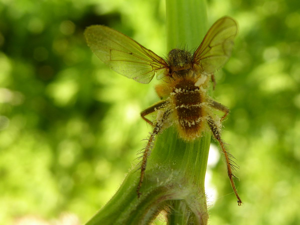 Vanmiddag aangetroffen op geluidswal in Gouda, waar o.a. els en populier voorkomen. Volgens mij is het een door een schimmel aangetaste strontvlieg.Valt daar nog iets meer over te zeggen/vinden?