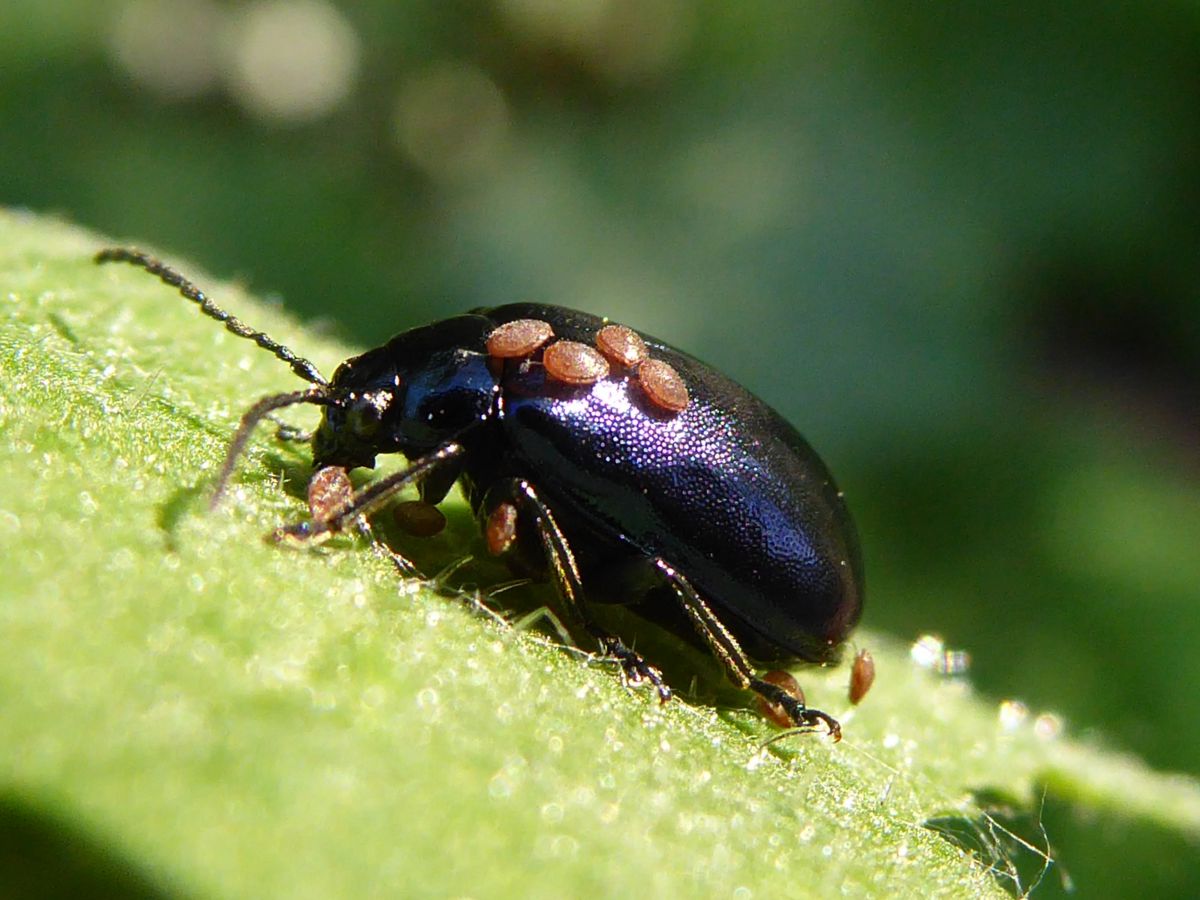 Vanmiddag op geluidswal aangetroffen. Er staat o.a. veel els en populier.Volgens mij is dit een elzenhaantje met mijten op zijn lijf.Ik vraag me af, wat die mijten daar precies doen en of ze nadelig zijn voor hun gastheer.