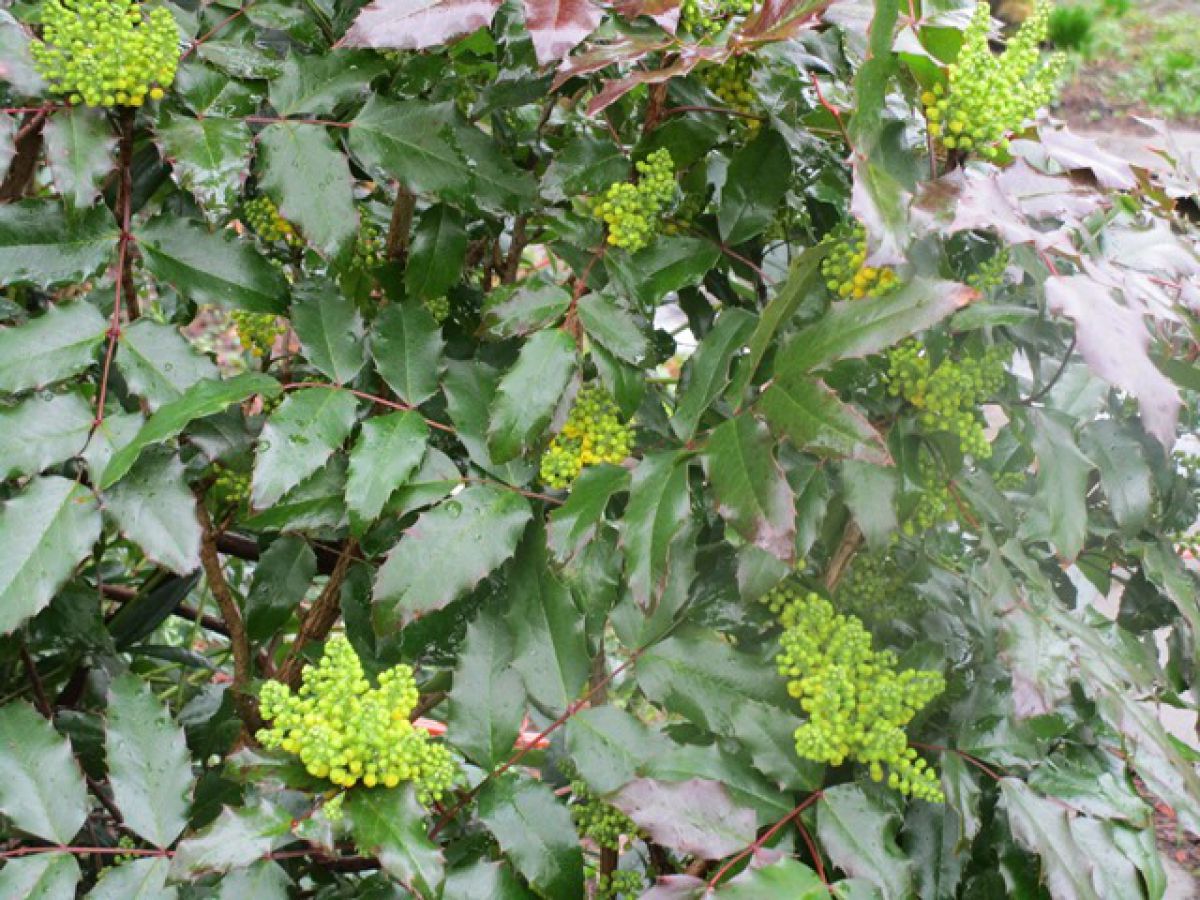 Deze struik met donkergroen gekarteld blad lijkt me een mahonia soort. Heb ik gelijk.