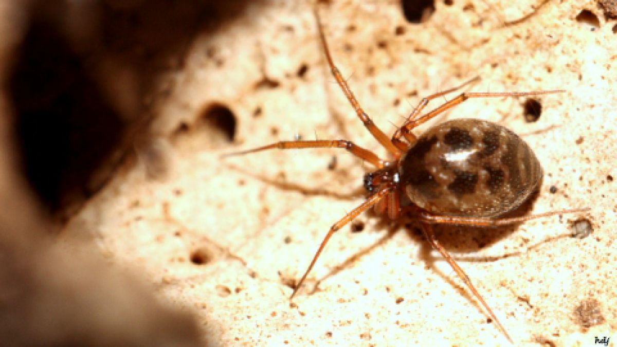 Een spinnetje waarvan ik denk dat het een hangmatspin zou kunnen zijn. Het is een spinnetje van 3-4 mm groot.Ik vond het in een holletje van een steen. Helaas met de kop naar binnen gericht zodat ik de oogjes er niet goed op heb staan. Wel het achterlijfje...ik heb gezocht en kwam uit bij de Lepthyp...