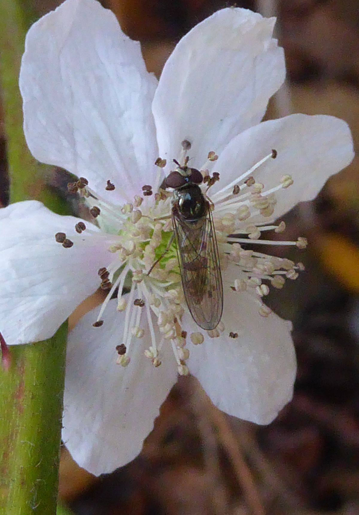 Vanmorgen aangetroffen op bloem braam in duingebied (Den Haag, Solleveld). Na één foto was de vlieg gevlogen, dus ik vrees dat het "zweefvlieg onbekend" zal blijven.