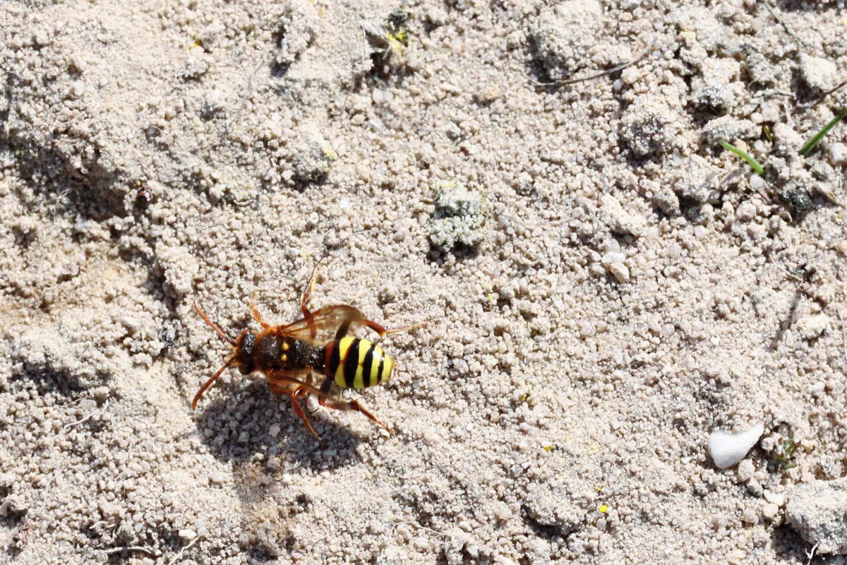 Op de Brunssumerheide in Zuid Limburg landde deze "bij" en begon zich gelijk in te graven in het zand. In enkele seconden al was hij verdwenen. Ik kan dit insect niet op naam brengen, wie weet wat het is?