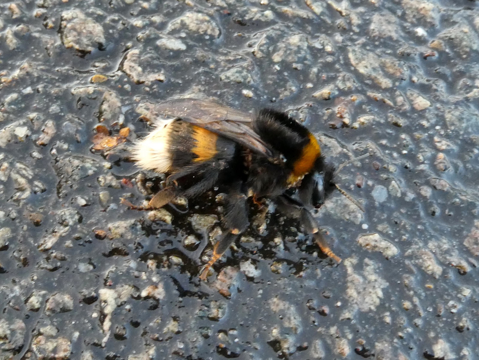 Deze aardhommel wil bij 8 gr. Celsius een fietspad lopend oversteken. Een levensgevaarlijke actie aangezien het beestje bij deze temperatuur niet in staat is om te vliegen.