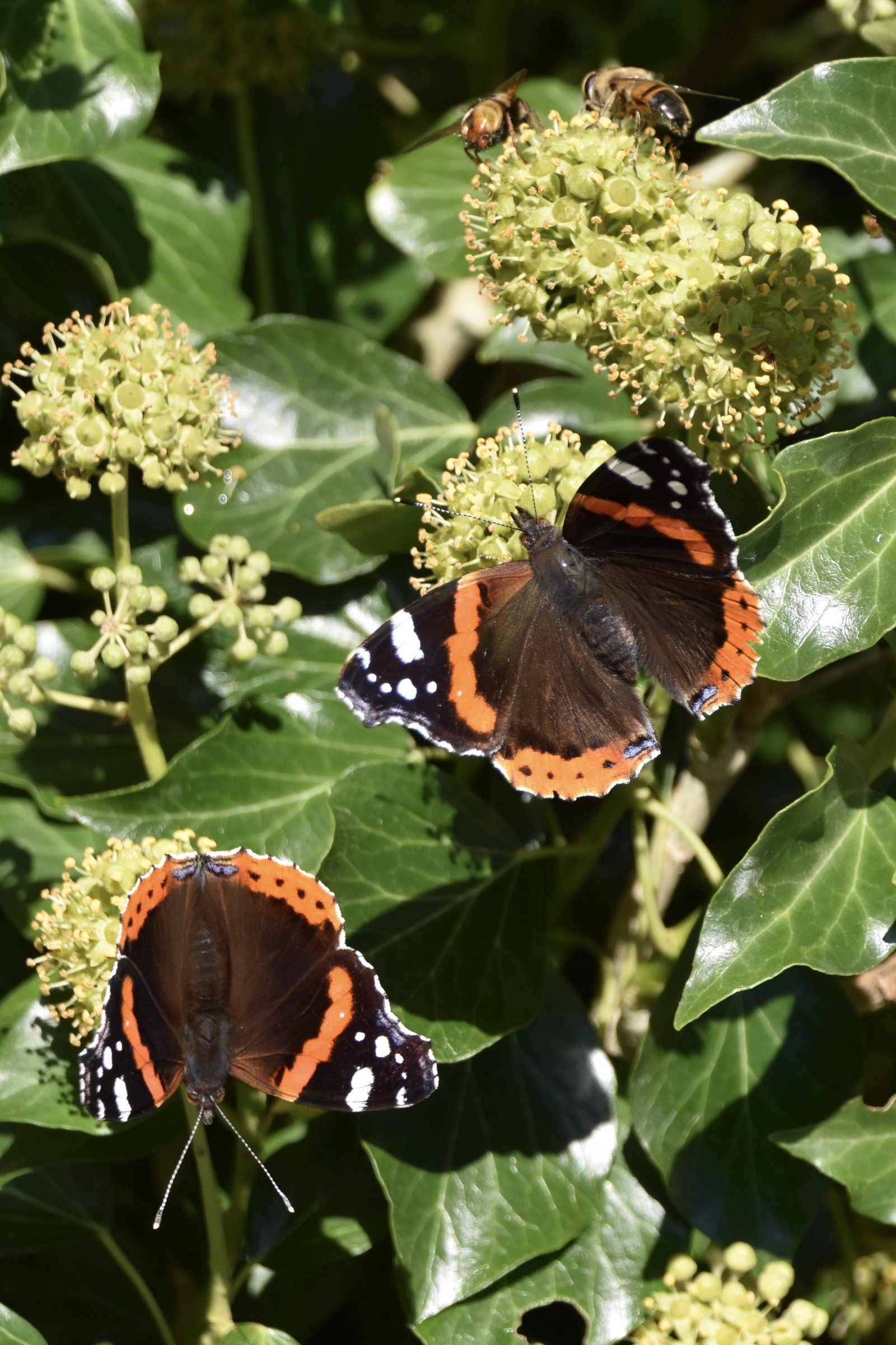 Ik zag dit ook in de al geheel bloeiende klimop van mijn buurman. 4 Atalanta's.