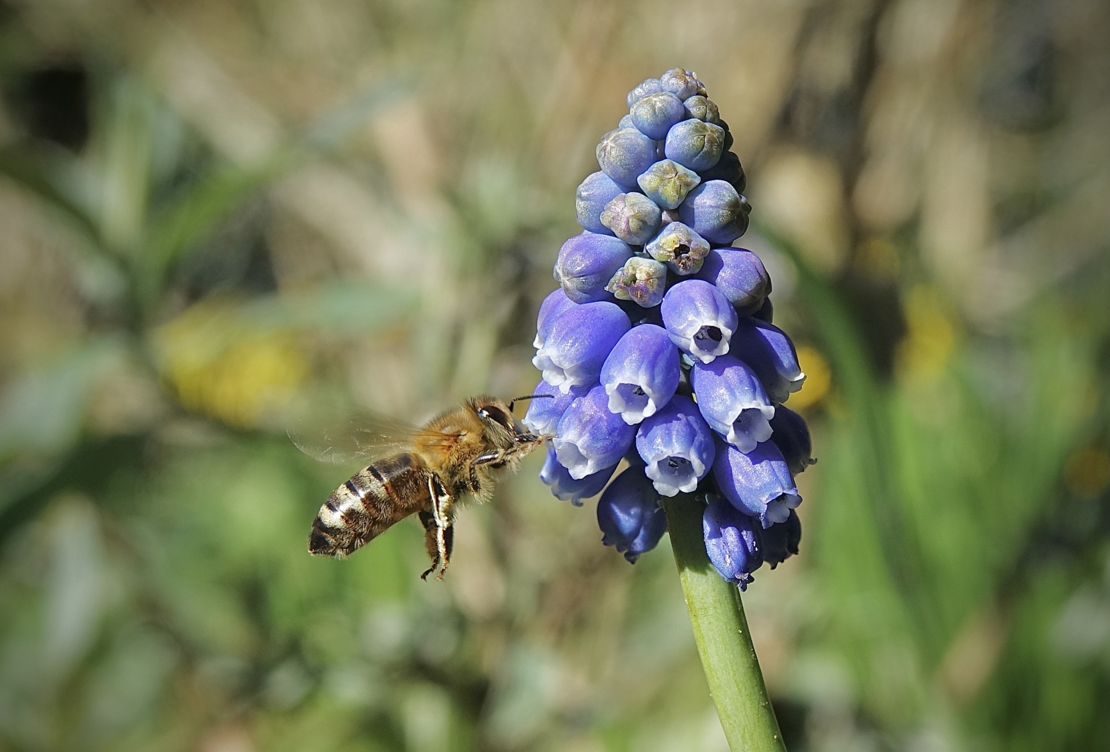 Het echte lentegevoel, deze momentopname van het bezoek van de bij aan dit blauwe druifje! Proficiat!