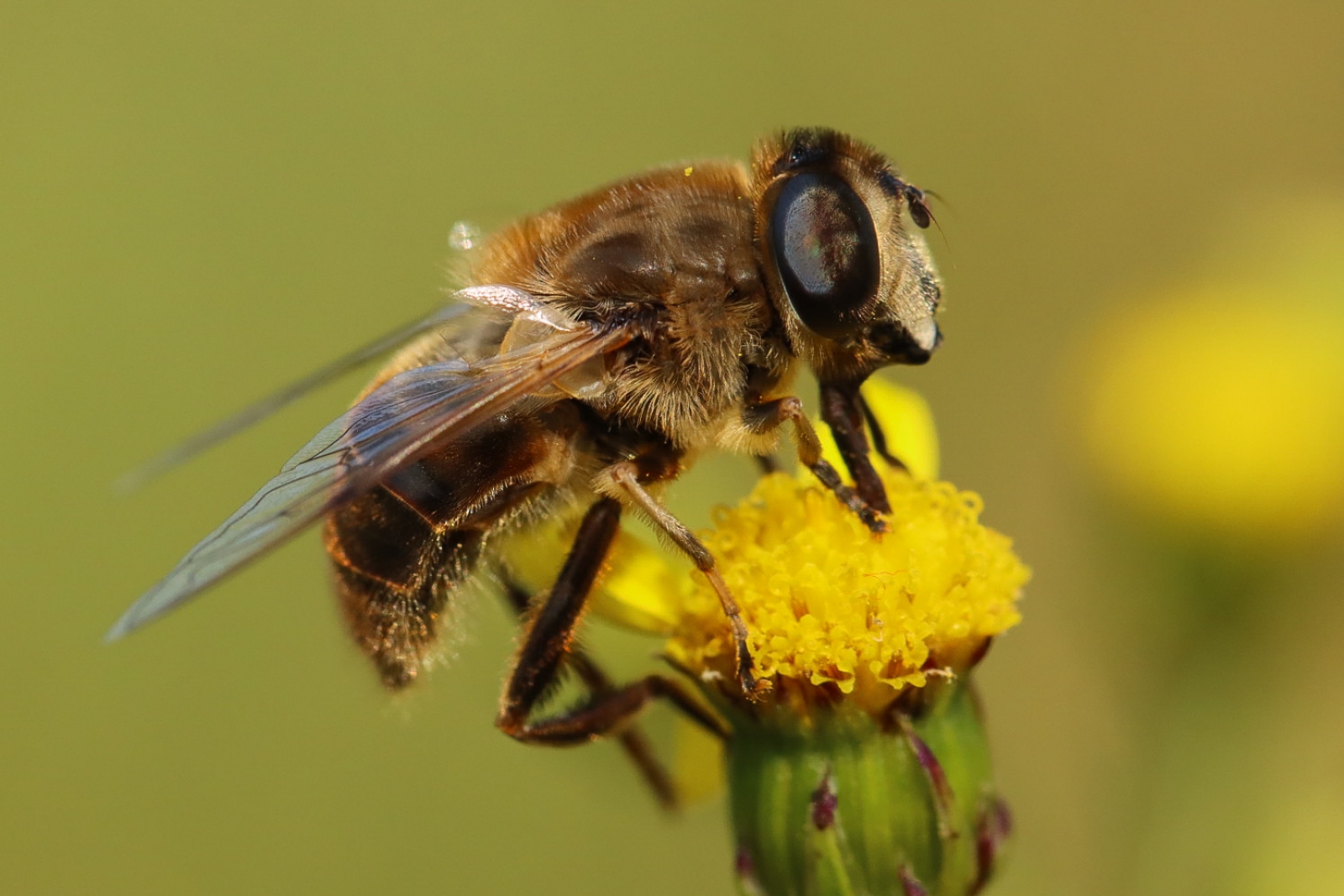 Een bij is het niet, deze zweefvlieg, en blind evenmin. Voor de foto maak het natuurlijk allemaal niet uit. Deze vloog in Meijendel.