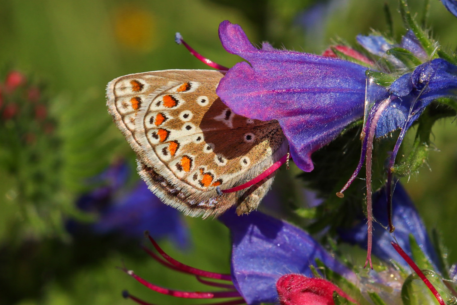 Een bruin blauwtje kruipt diep weg in een bloemetje van het slangenkruid. Meijendel.
