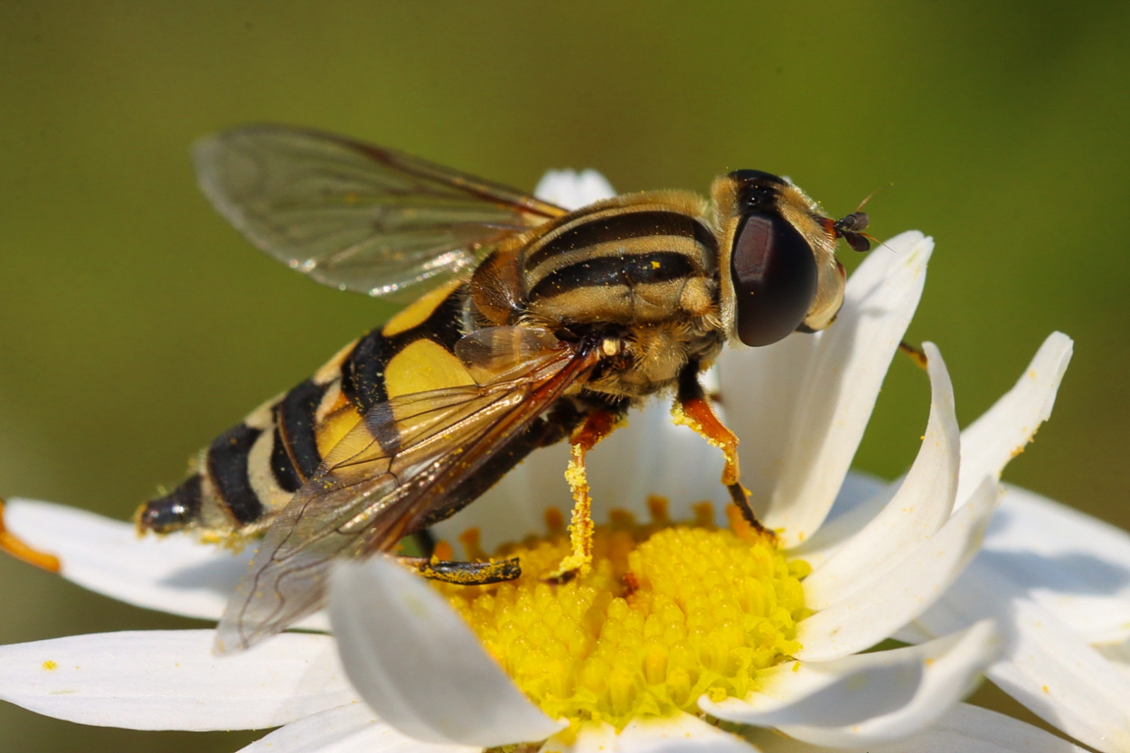 Een citroenpendelvlieg met poten vol stuifmeel, Meijendel.