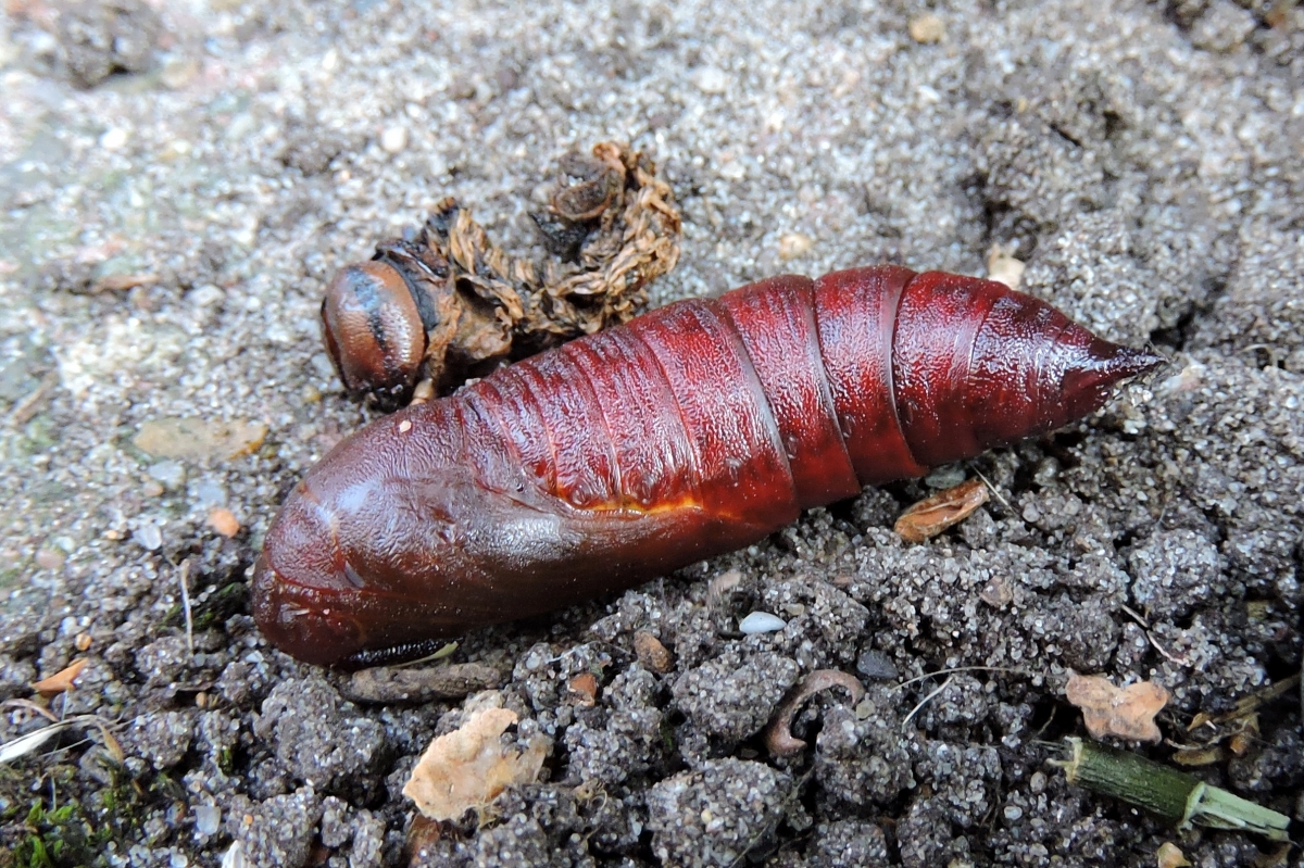 Laatst kwamen we de rups van de Dennenpijlstaart tegen in de dennenboom bij de buurman. Vandaag zagen we de pop van deze rups onder de kamperfoelie in mijn tuin, met het overgebleven rupsenvelletje ernaast.