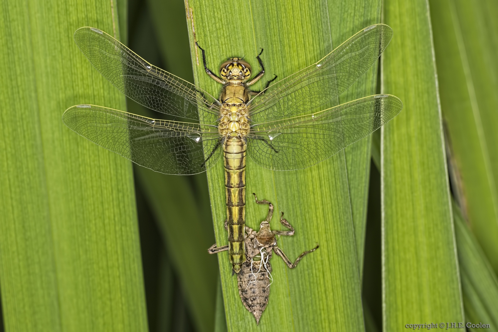 Prachtige serie. Deze foto vind ik gaaf: de libel in volle glorie met daarnaast zijn oude, te krappe behuizing.