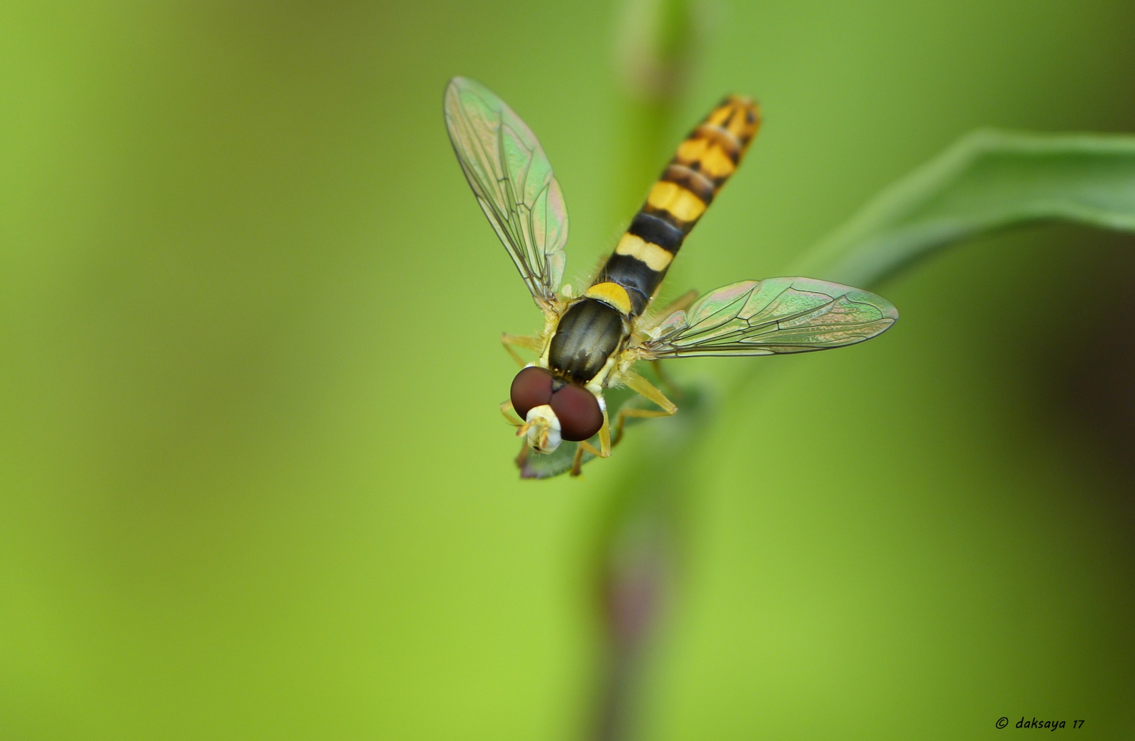 Een zweefvlieg met een lang, slank achterlijf dat zwart met gele banden of vlekkenparen is. In rust steekt het achterlijf een stuk onder de vleugels uit. De soort is vooral in de kruidvegetatie en op bloemen te vinden. De larven leven als rovers op bladluizen op allerlei kruiden. Ze komt regelmatig in tuinen voor.