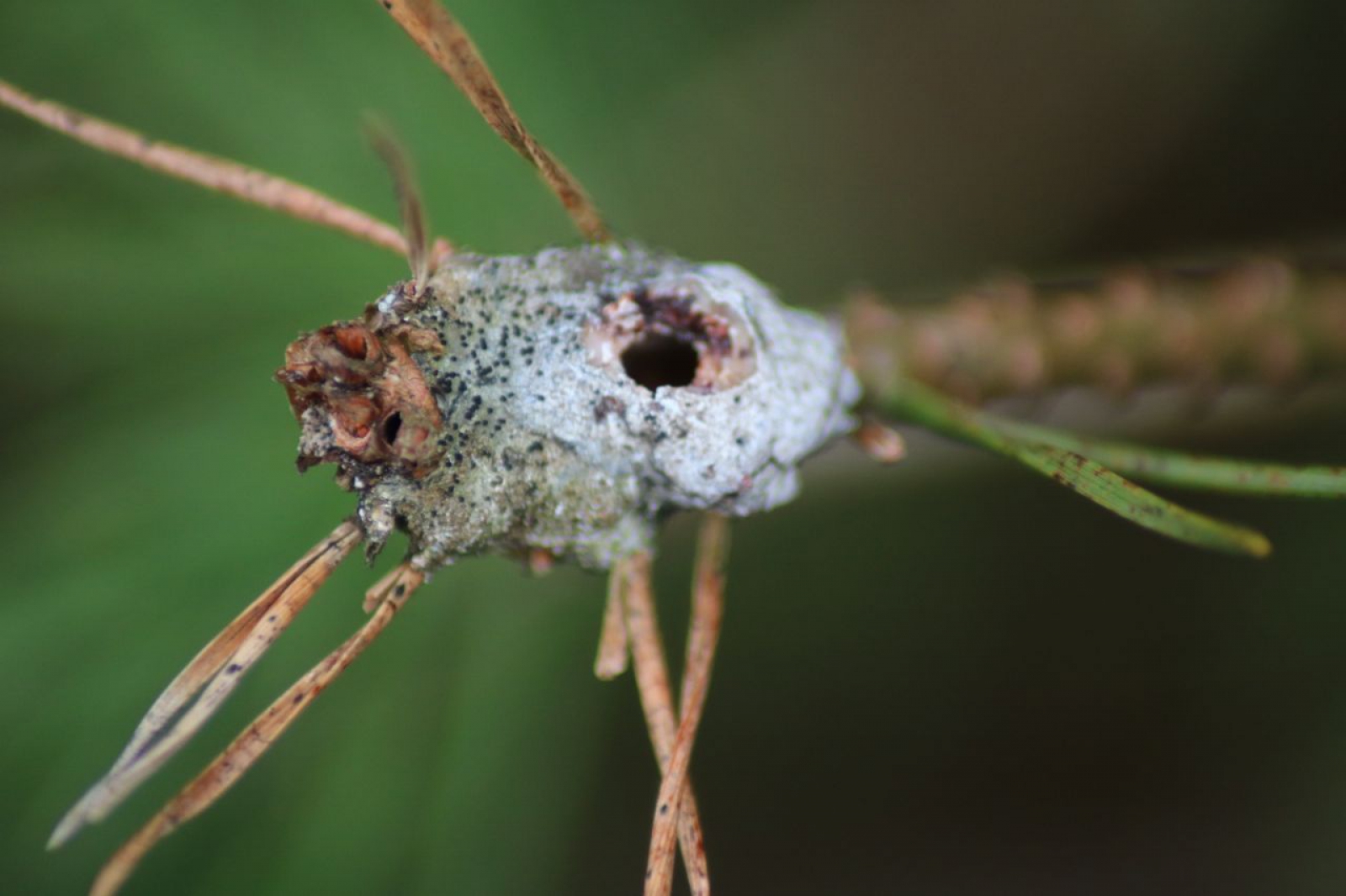 De harsbuilmot.. De rusp is al ontpopt in dit mooie exemplaar. Je ziet het gaatje waar hij uitgekropen is.