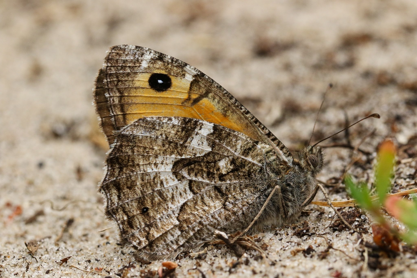 Vliegend lijkt hij wat op een zandoogje, maar de tekening op de onderkant van de vleugels is waar je de heivlinder goed aan herkent. Deze kwam tussen de buien door steeds terug naar hetzelfde zandpad om op te warmen in de zon. Noordhollands Duinreservaat.