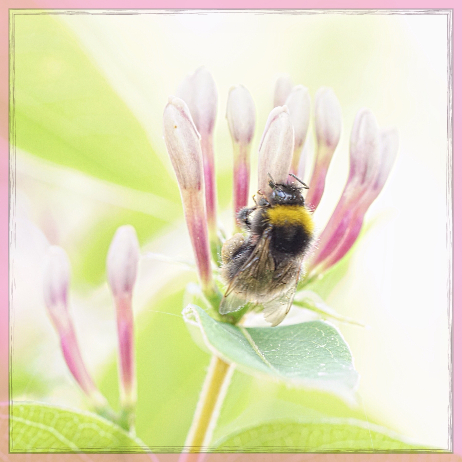 Tegenlichtopname van hommel op kamperfoelie