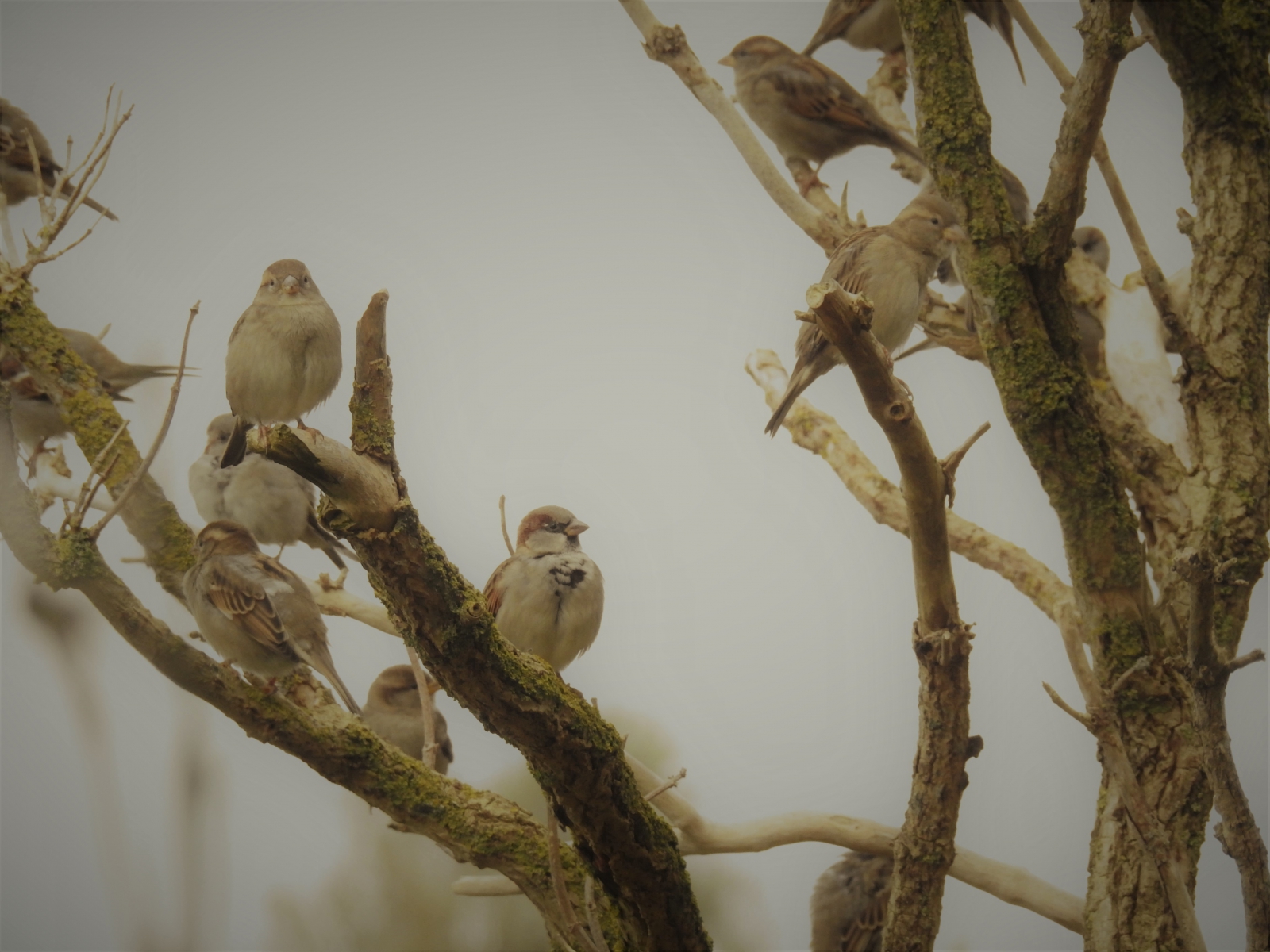 De mussen vlogen in groepen van struik naar struik aan de winderige kust van Rügen.