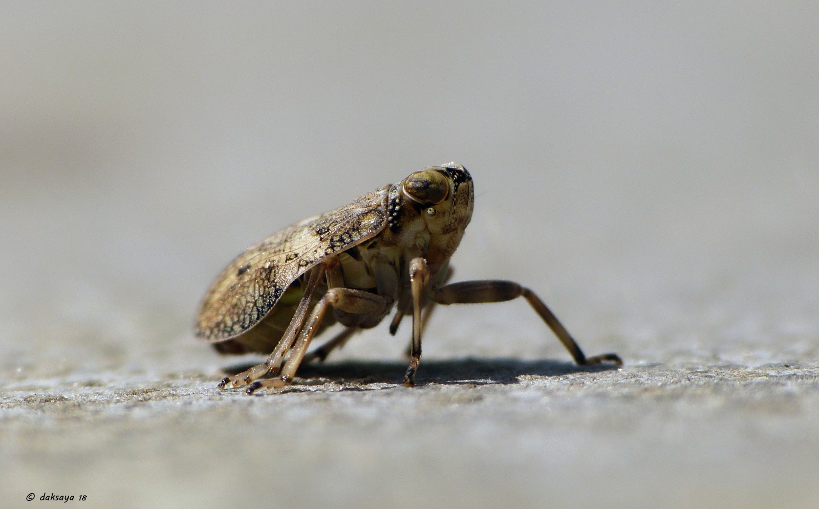 ... dit grappig maar schuw diertje ( 5,5-7,0 mm) dat tot de cicaden familie hoort op de foto te zetten. Je ziet ze zo af en toe onopvallend in de tuin zitten, deze keer op de stoep. Wel plat op mijn buik moeten liggen om hem goed in beeld te krijgen. Dit is al een wat volwassen exemplaar.