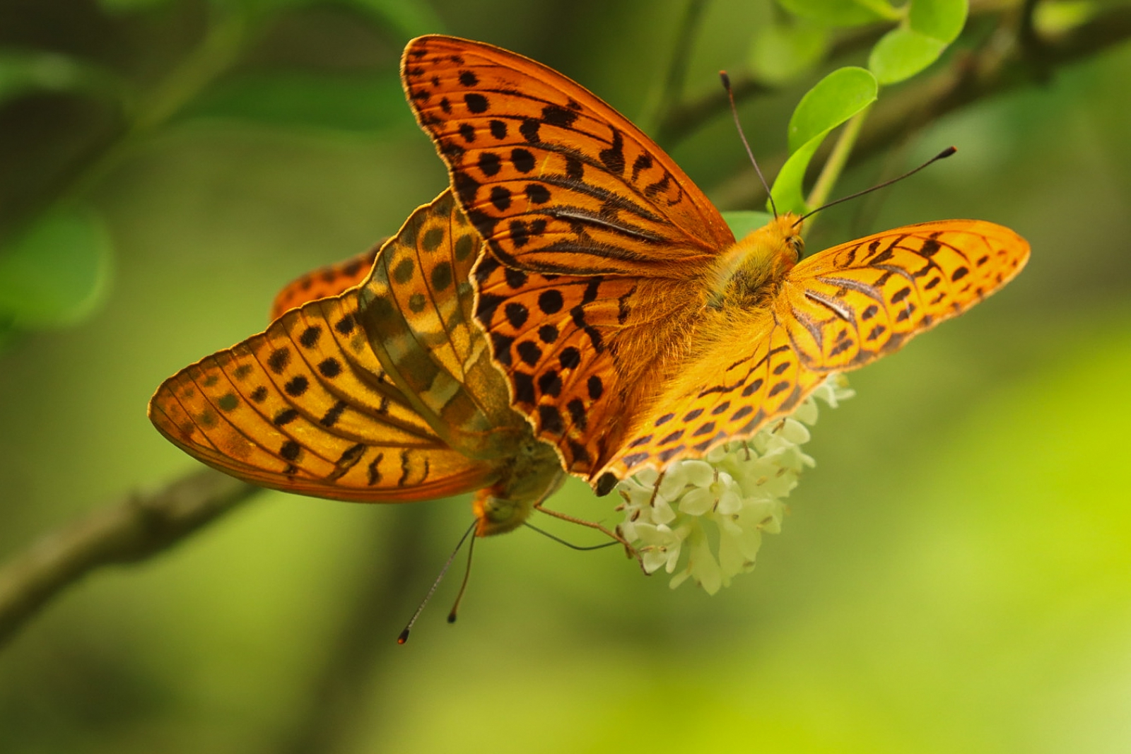 Verschillende wilde ligusters waren al bijna uitgebloeid. Eentje had nog volop witte bloemtrossen en was gewild bij de keizersmantels. Deze twee mannetjes kozen dezelfde tros uit om te foerageren.