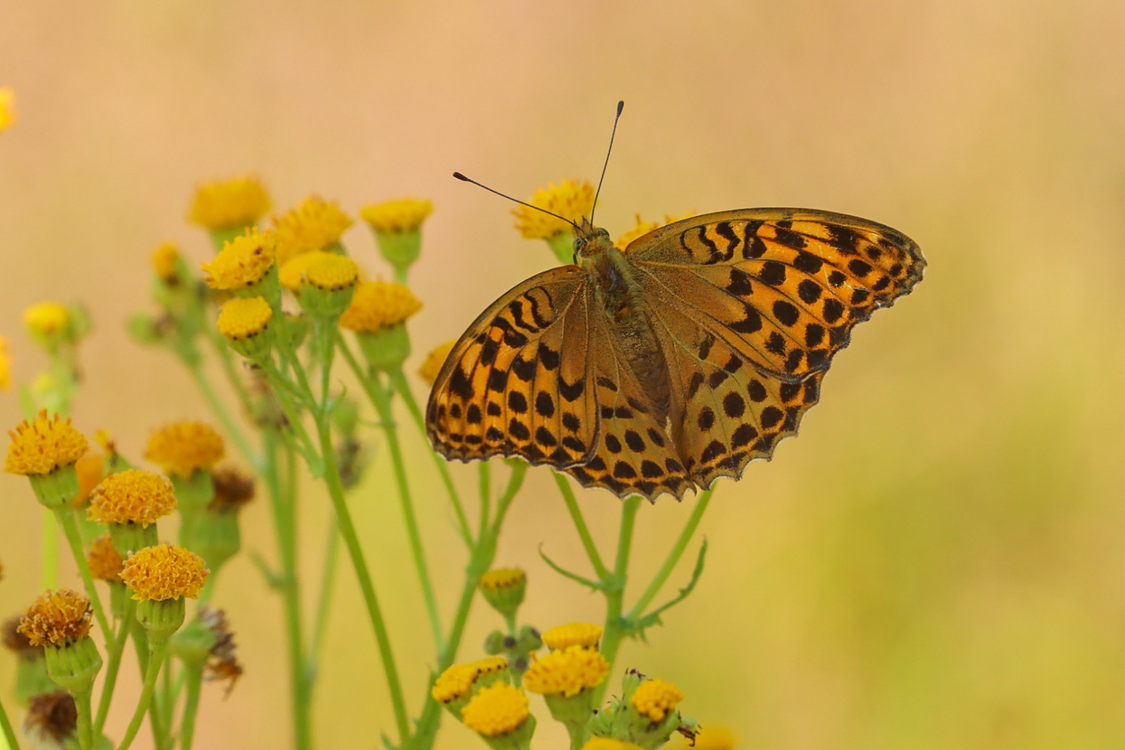 Meijendel, midden op de dag met een felle zon. Deze nog ongeschonden keizersmantel (v) fladderde in de schaduw rond het duinkruiskruid. Het resultaat van de foto vond ik verrassend.