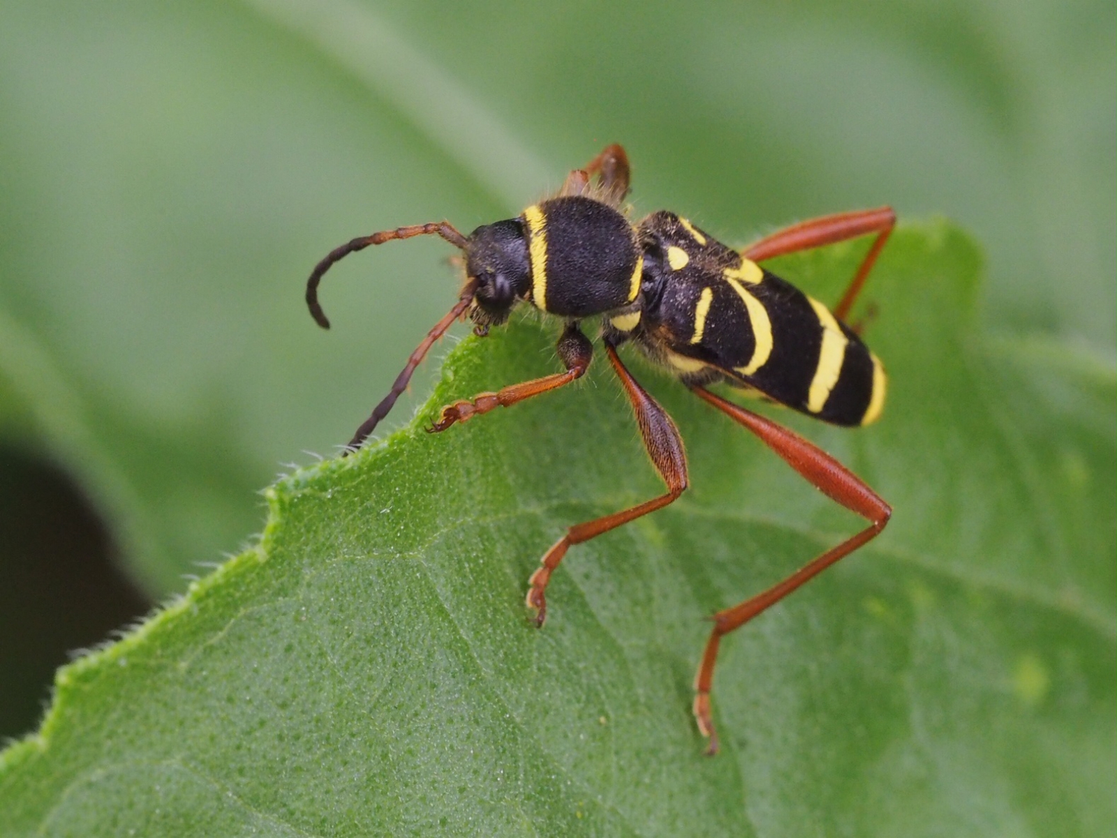 Ook ik was er bijna ingetrapt. Vanuit een ooghoek kijkend dacht ik een wesp. Maar bij beter kijken zag ik dat het een wespenbok was. Zeer geslaagde vorm van mimicry die maakt dat de wespenbok niet snel wordt opgegeten door bijv. vogels of andere insecteneters. Zelfs de smaller wordende taille doet denken aan een wesp!