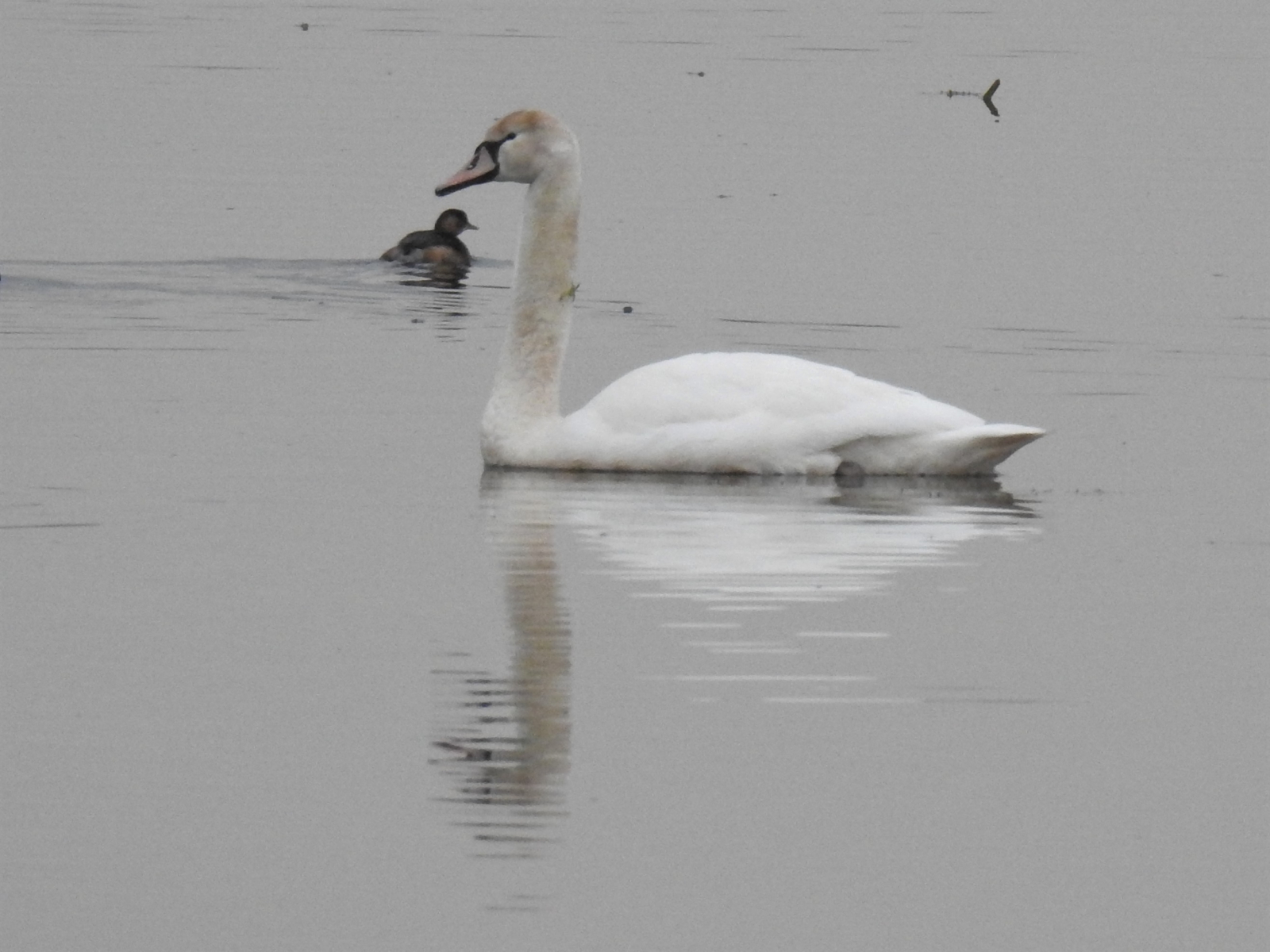 Een knobbelzwaan samen met een dodaarsje op de retentievijver Dakhorst bij Wierden.