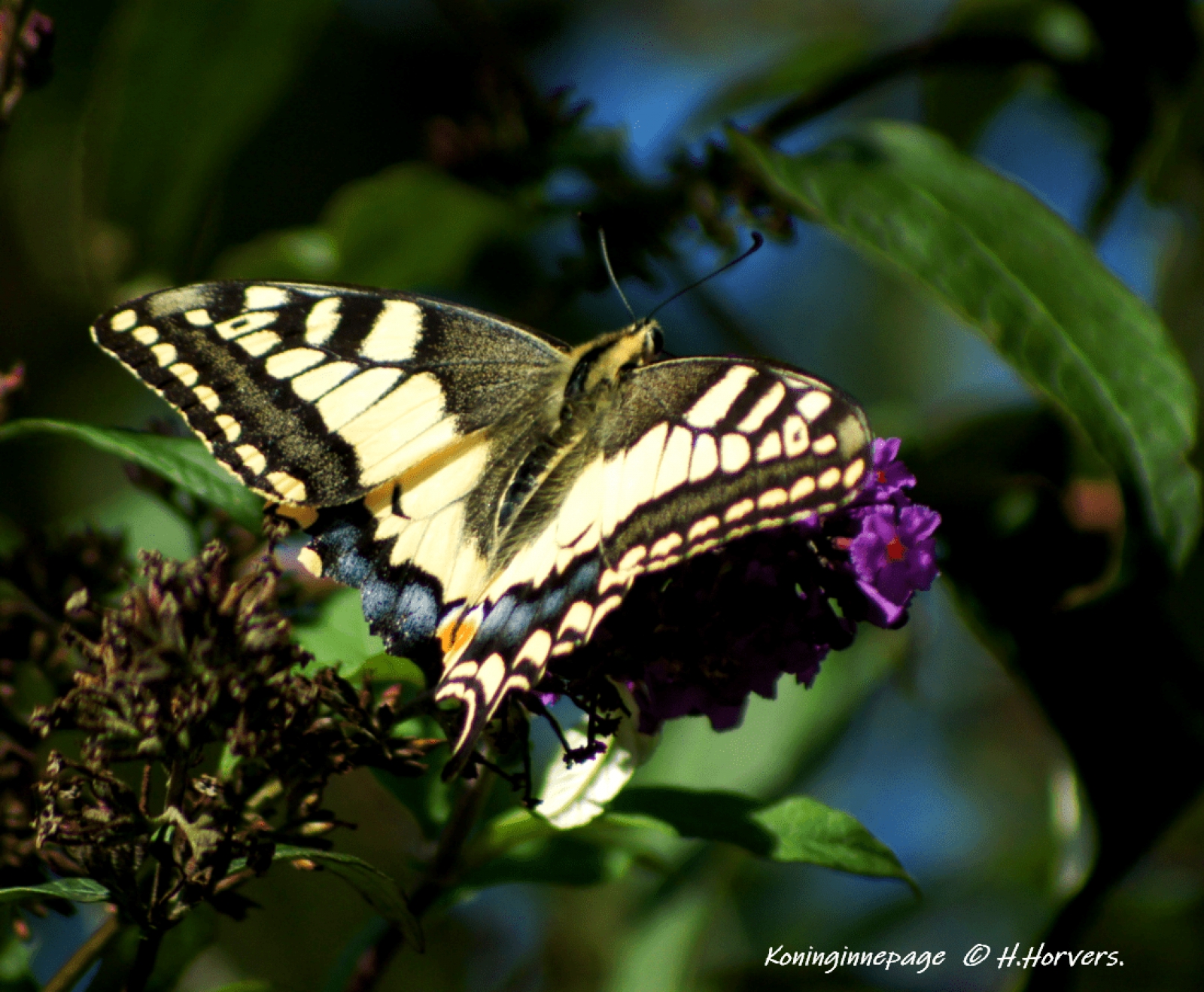 Donkere foto, mooie vlinder ook al is z'n kontje afgehapt !