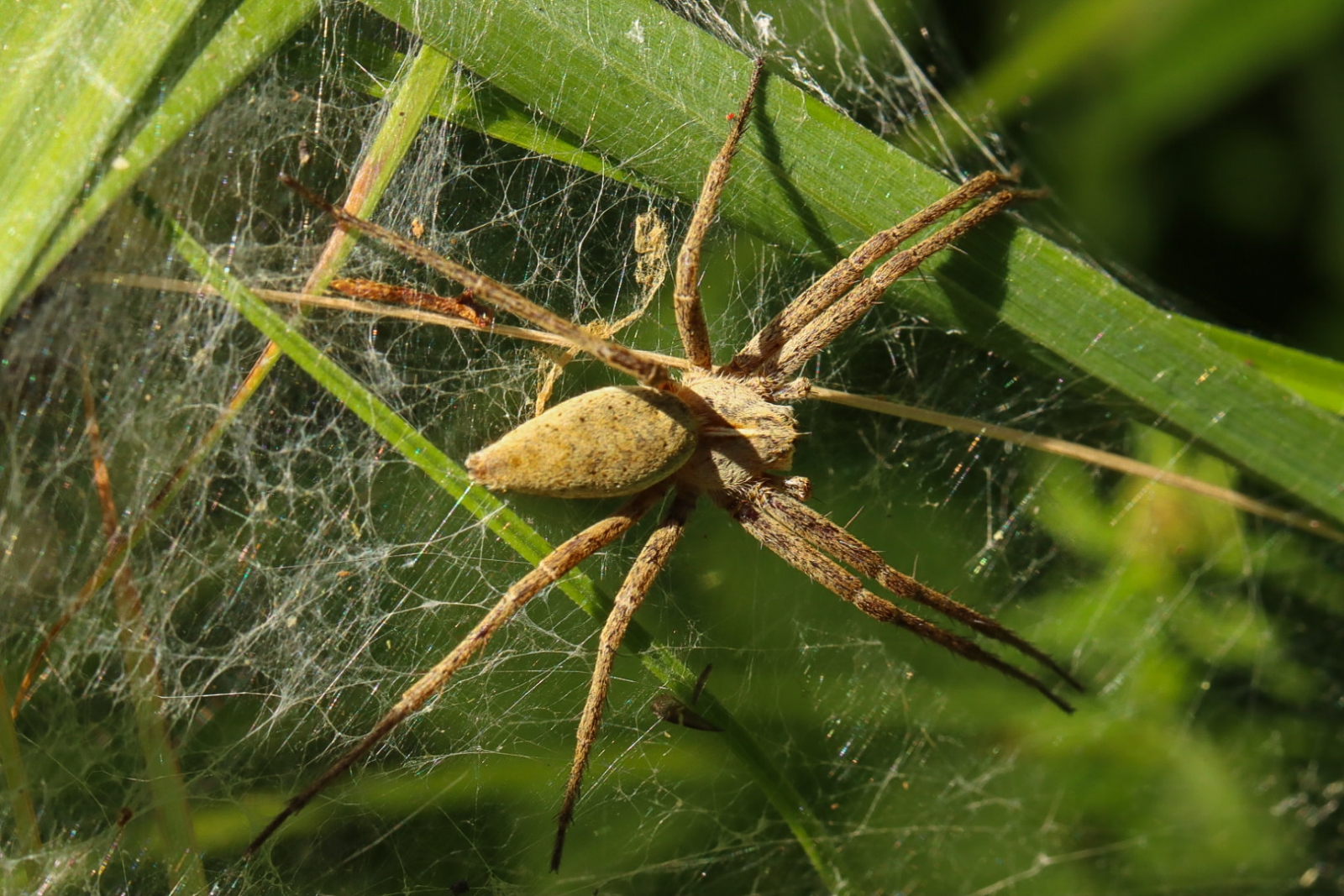 Een kraamwebspin zit in een web vlakbij de plek waar haar jongen uit de eicocon kruipen (zie tweede foto).