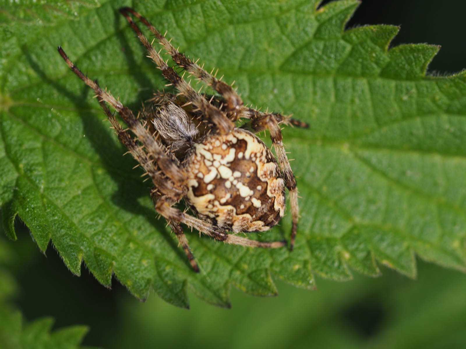 Meest getelde spin, de kruisspin, in het zonnetje.