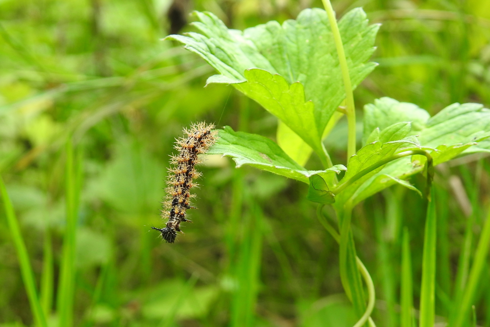 De rups van het Landkaartje is zwart met roodbruine of zwarte doorns.