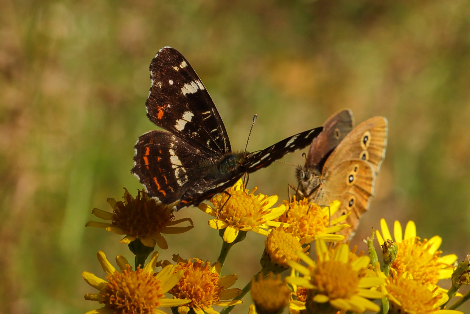 Tegenover elkaar op het jakobskruiskruid: een landkaartje en een koevinkje in Meijendel.