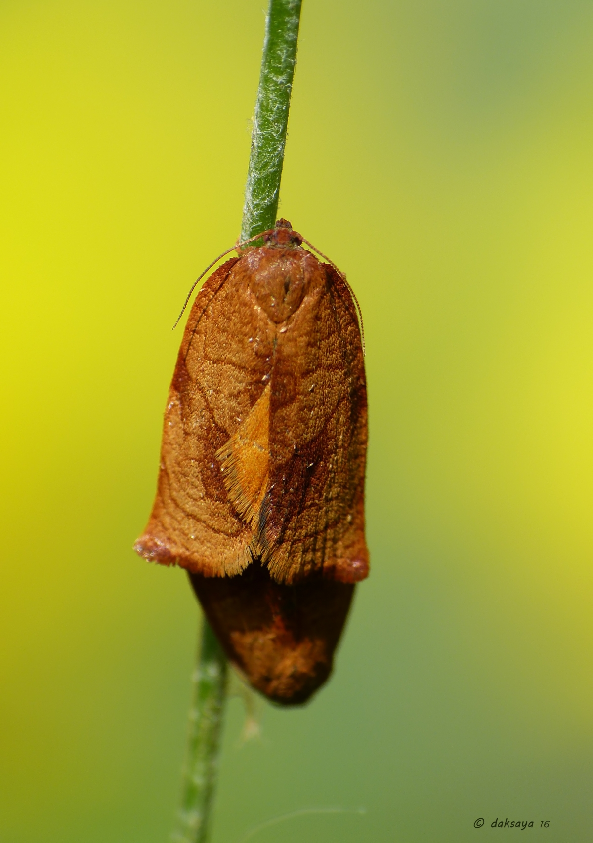 Ik dacht eerst dat het twee verdorde blaadjes aan een takje waren. Bij nader inzien bleken het twee parende leverkleurige bladrollers te zijn. Het vrouwtje (of mannetje) hangt er onder.