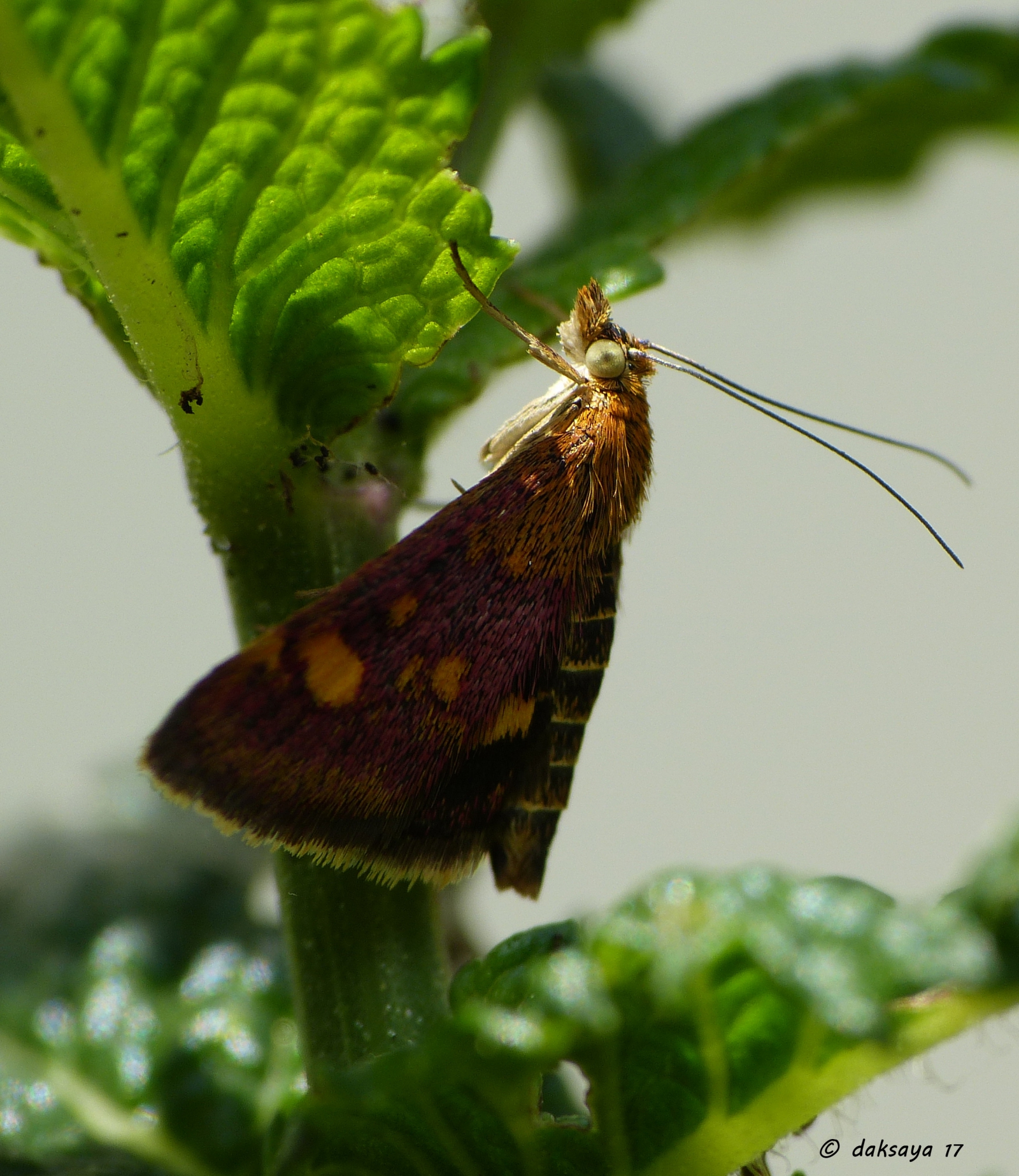 De rups is donkergroen met zwarte vlekken en leeft op wild kattenkruid (Neparia cataria) en andere geurige lipbloemigen zoals citroenmelisse (Melissa citronalis). De rupsen uit de tweede generatie overwinteren op deze planten en verpoppen zich nadien in een spinsel in de grond.