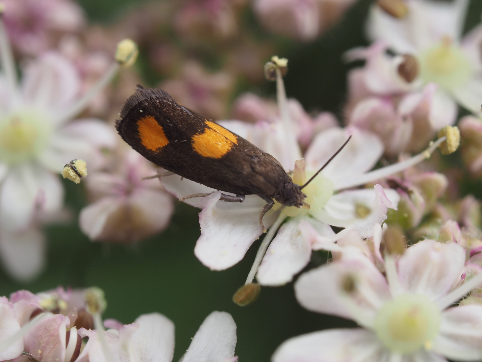 In rust lijkt het of dit vlindertje drie oranje vlekken heeft, houdt van de berenklauw als waardplant.