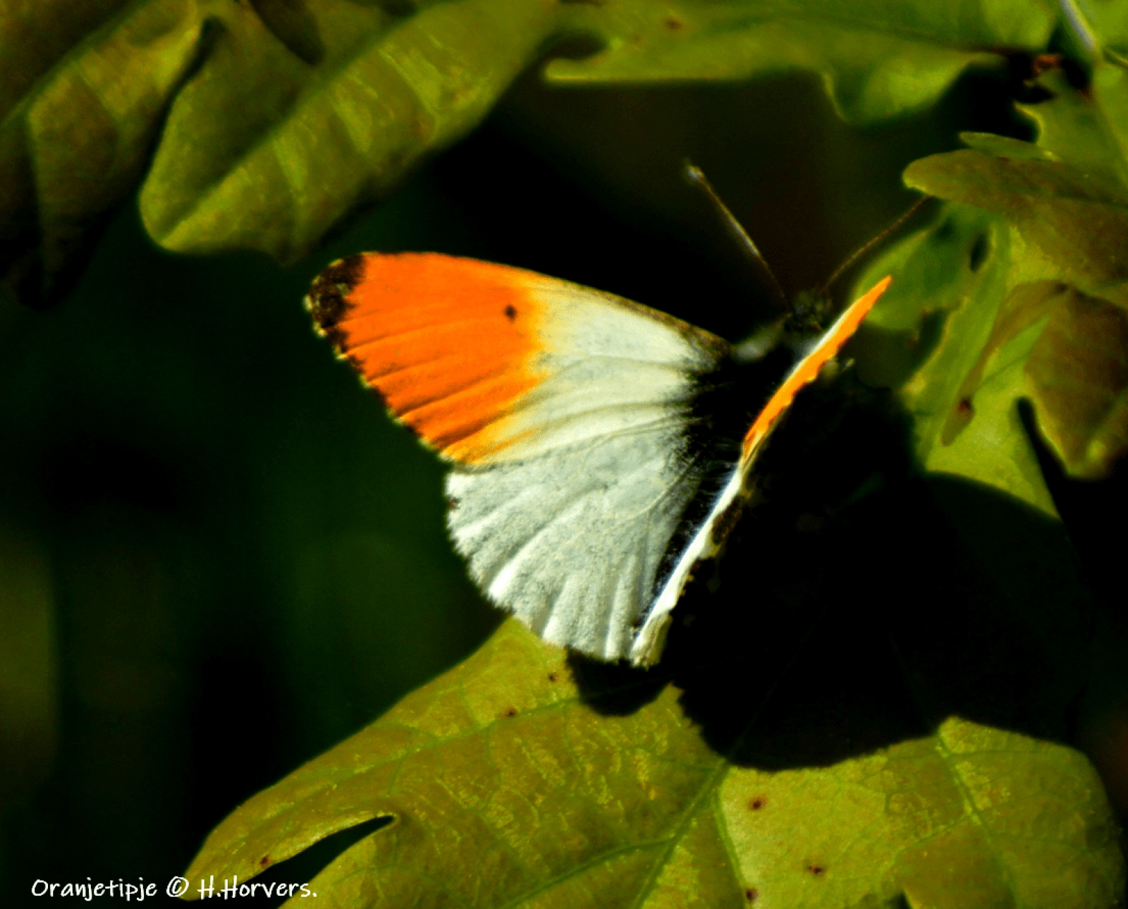 Oranjetipje op eikeblad