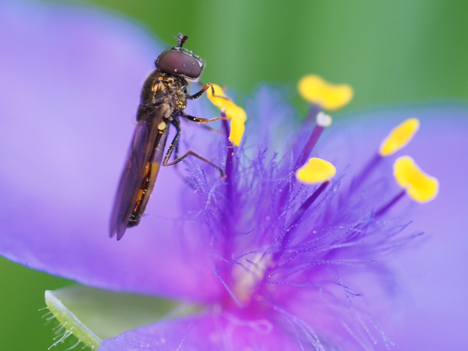 is het reflectie of toeval dat de vleugels van deze mooie zweefvlieg dezelfde kleur hebben als de bloem, waar deze op zit.